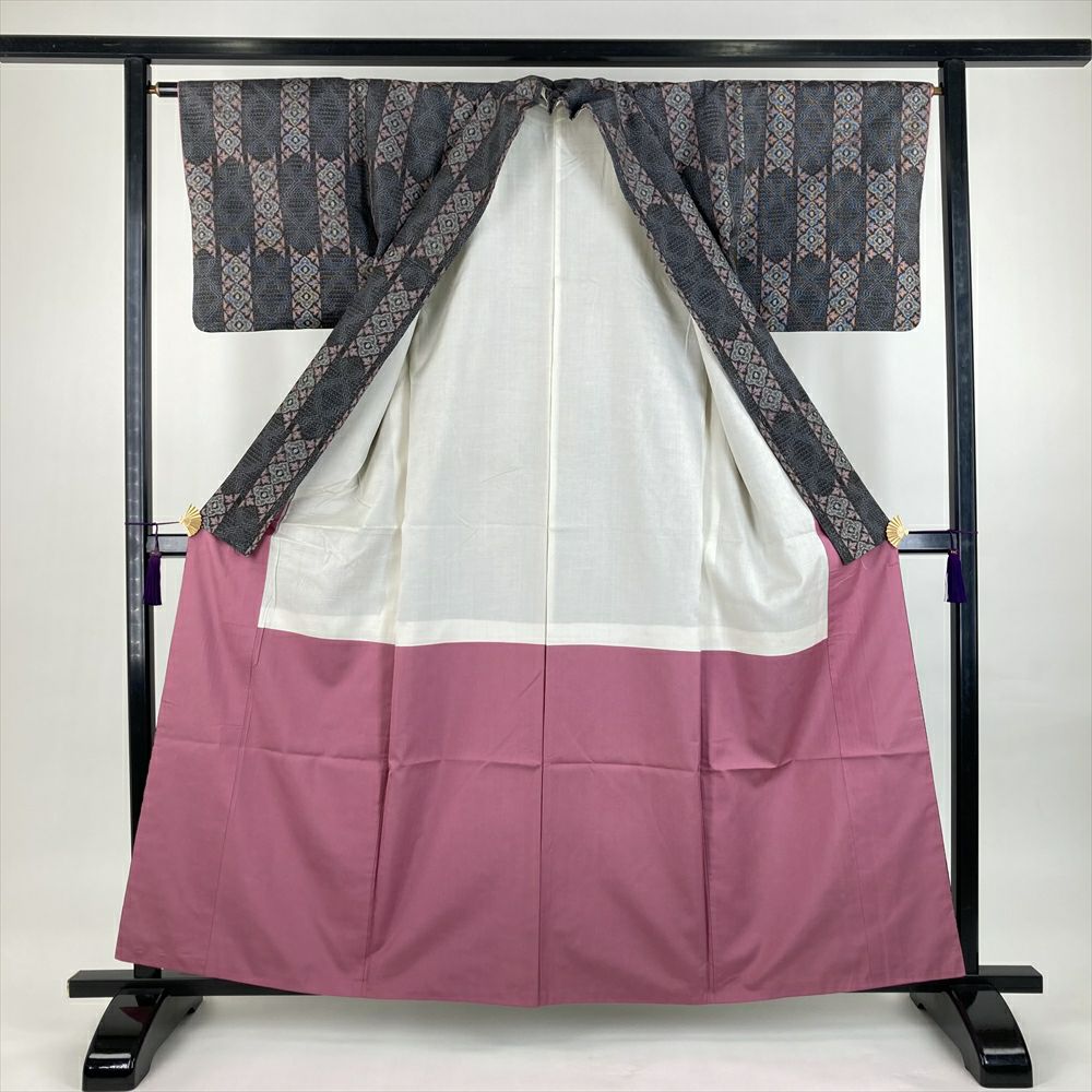 (中古)紬 墨黒 ピンク カジュアル 織り 縦に花と松皮菱 袷 SS【身丈】154cm【裄丈】64.5cm