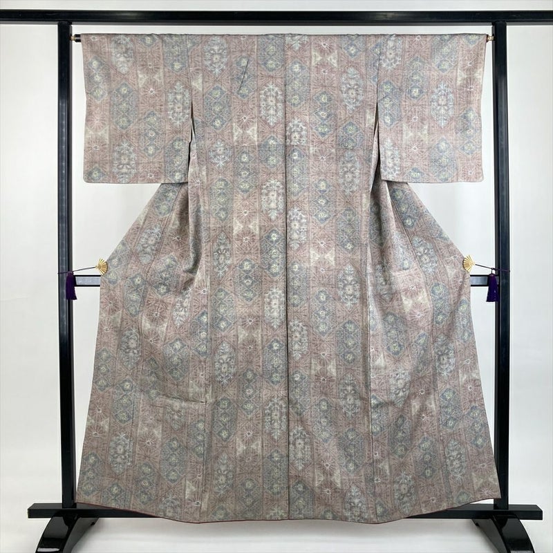 (中古)紬 グレー 薄灰 カジュアル 織り 菱取り 草花 袷 SS【身丈】154.5cm【裄丈】65.5cm