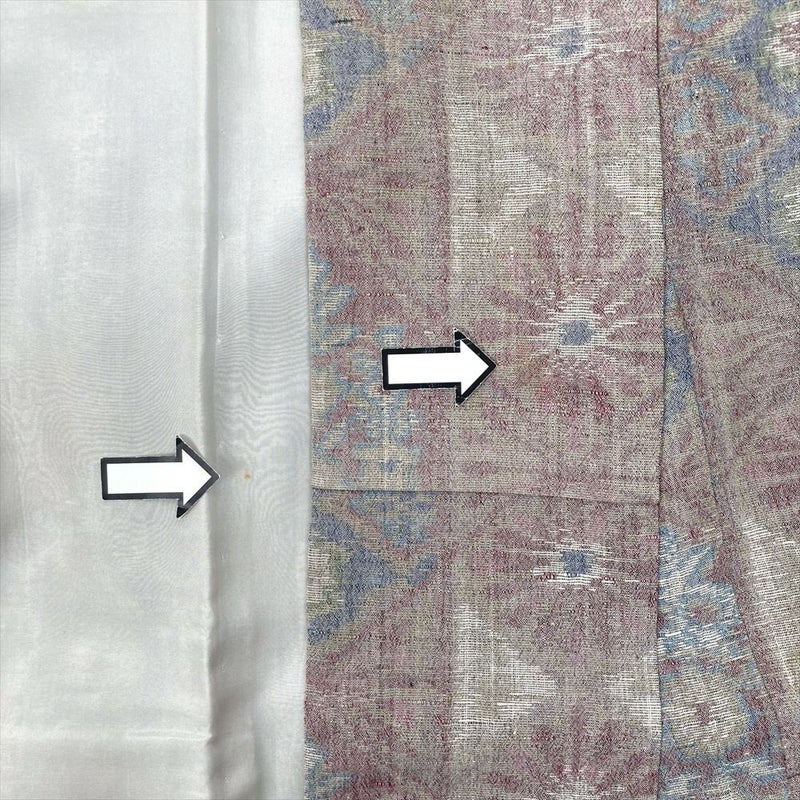 紬は、あらかじめ染めた糸を、縦・横に織って模様にします。糸1本1本を染めて織り上げるため、色落ちや劣化が少なく耐久性に優れています。カジュアルシーンで着用します。スナップの跡がございます。保存臭がややございます。袖口汚れあり。背中心裏 左衿 汚れあり。衿 スナップ跡あり。右肘脇裏シミあり。
