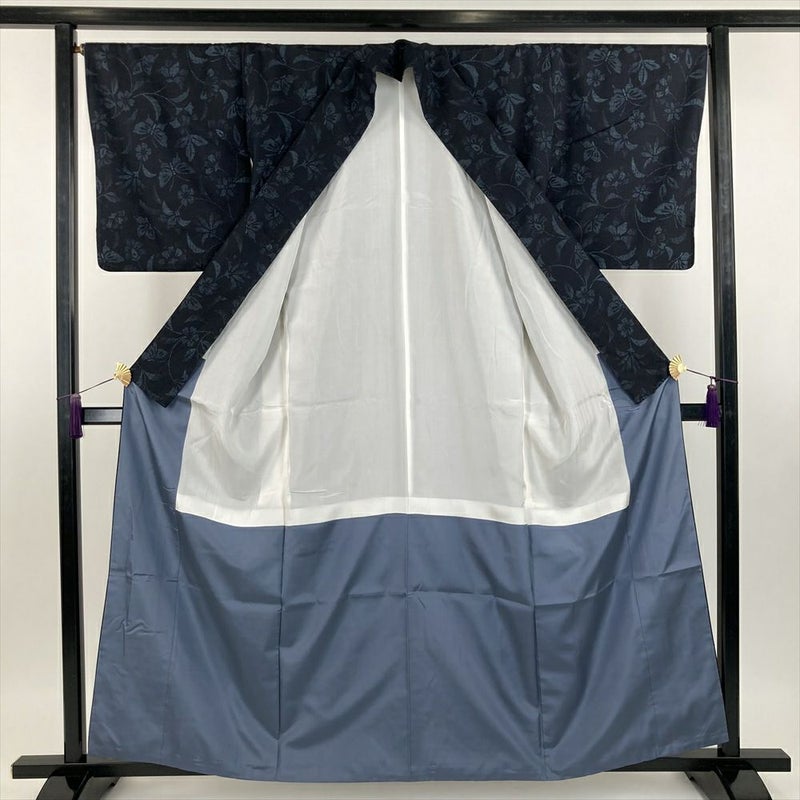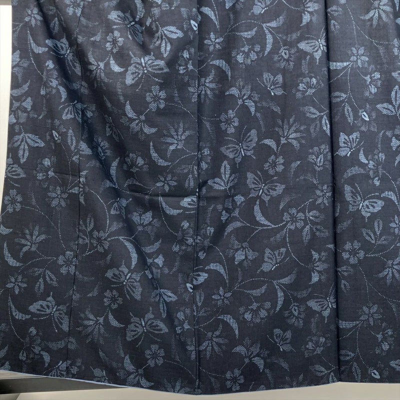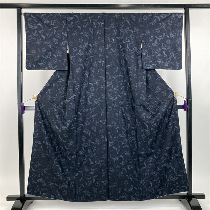 (中古) 紬 鉄紺色 カジュアル 花葉 蝶が舞う 袷【身丈】155cm【裄丈】67cm