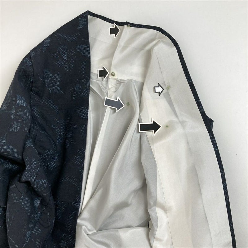 左右袖口に汚れがございます。衿裏、胴裏にスナップ汚れがございます。保存臭がややございます。