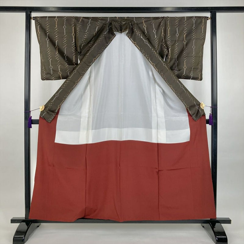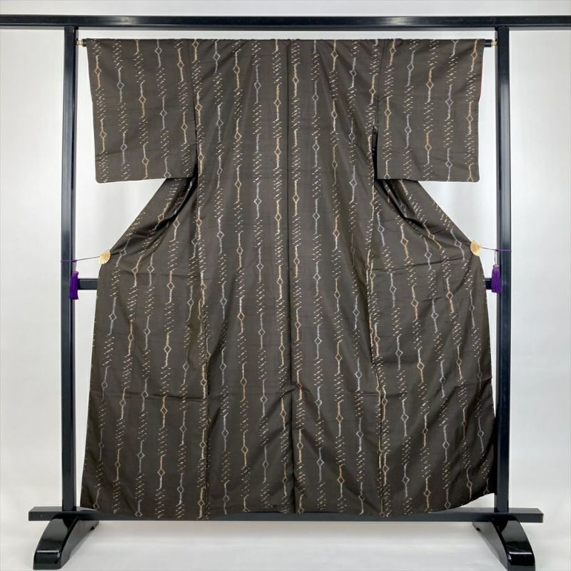 (中古)紬 焦げ茶 橙 カジュアル 織り 幾何学 袷 S【身丈】155cm【裄丈】65cm