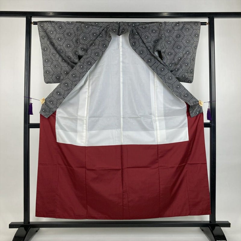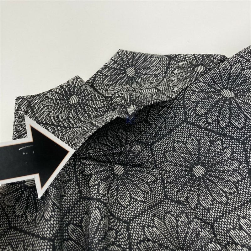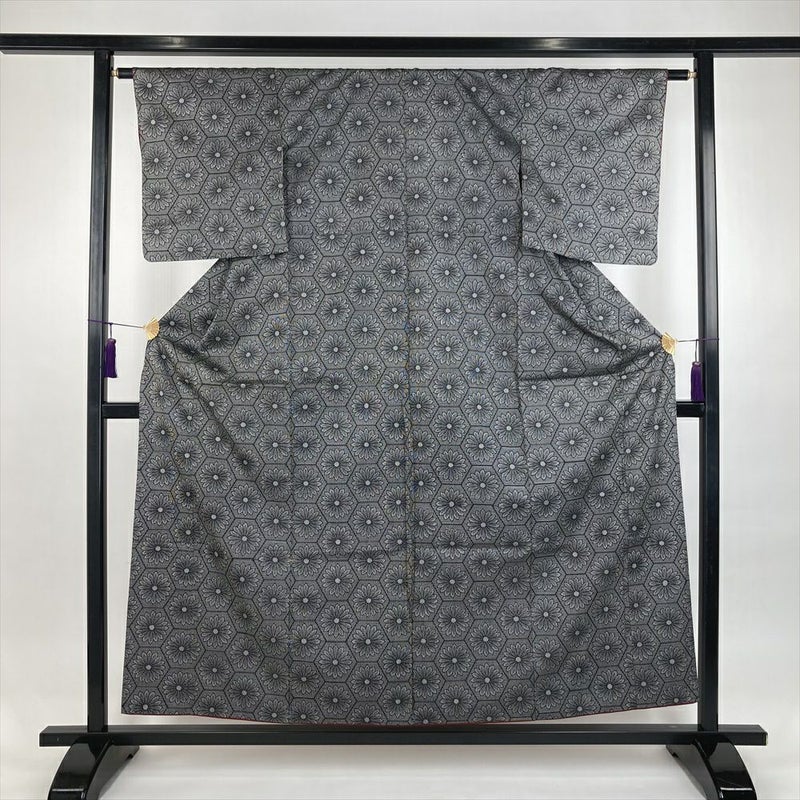(中古)紬 黒 カジュアル 織り 亀甲に菊 袷 SS【身丈】152cm【裄丈】62cm