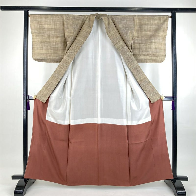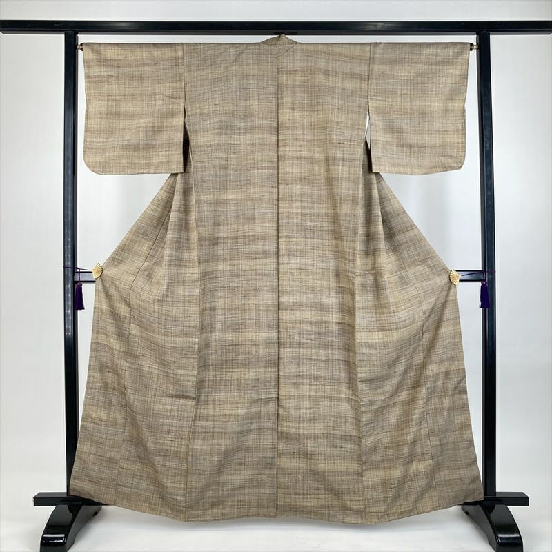 (中古)紬 柳茶 カジュアル 織り 横縞 グラデーション 袷 S【身丈】157.5cm【裄丈】66cm