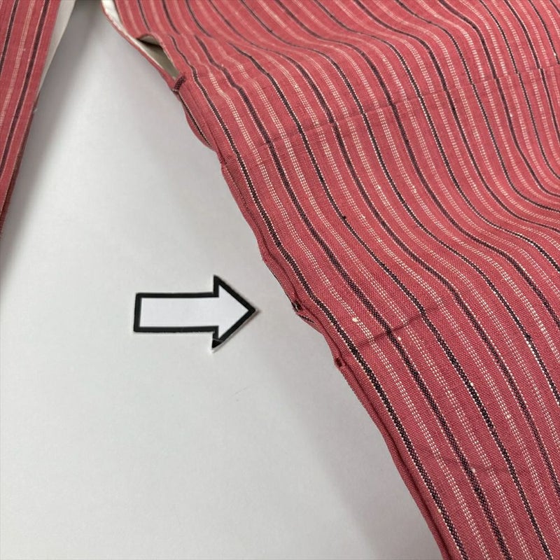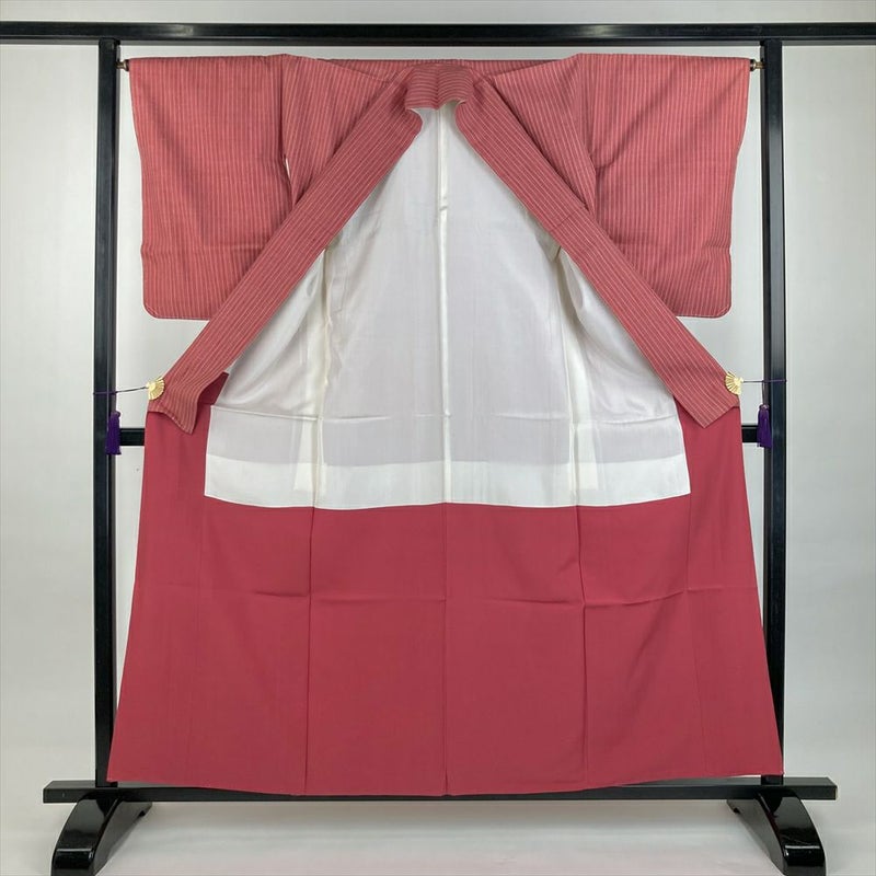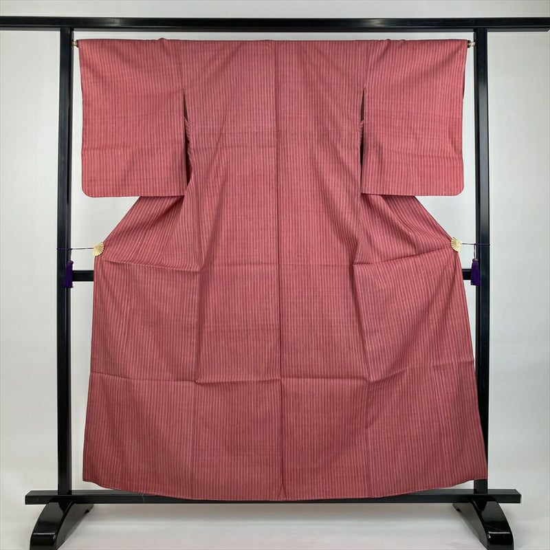 (中古)紬 紅梅 ピンク カジュアル 織り 変わり縞 袷 S【身丈】156cm【裄丈】66cm