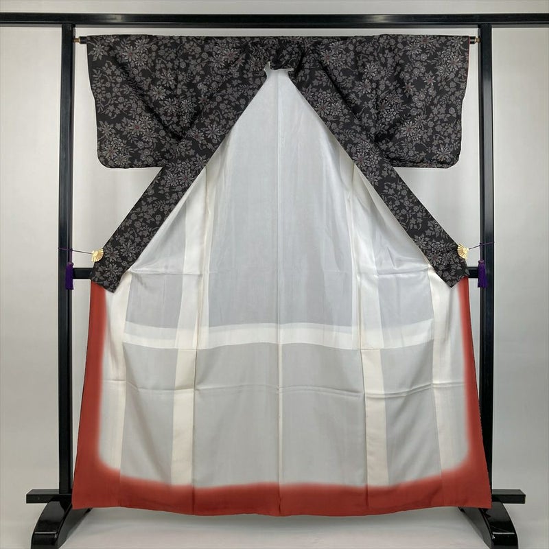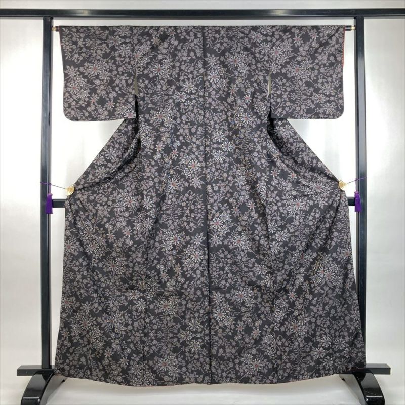 (中古)紬 焦げ茶 カジュアル 織り 5マルキ 四季の草花 袷 M【身丈】161cm【裄丈】64.5cm