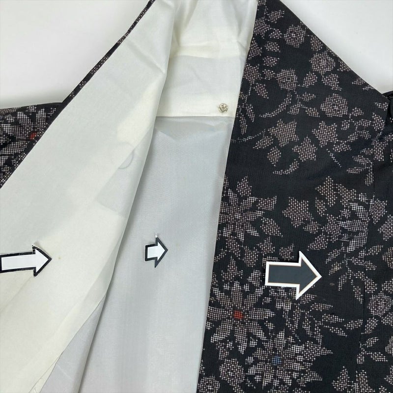 泥と絹糸から生まれる美しい織物大島紬は、すべすべした肌触り、ひかえめな光沢、緻密な絣模様が特徴です。軽くてシワになりにくく着心地も抜群です。保存臭がややございます。右衿裏 左衿表 胴裏汚れあり。大島紬