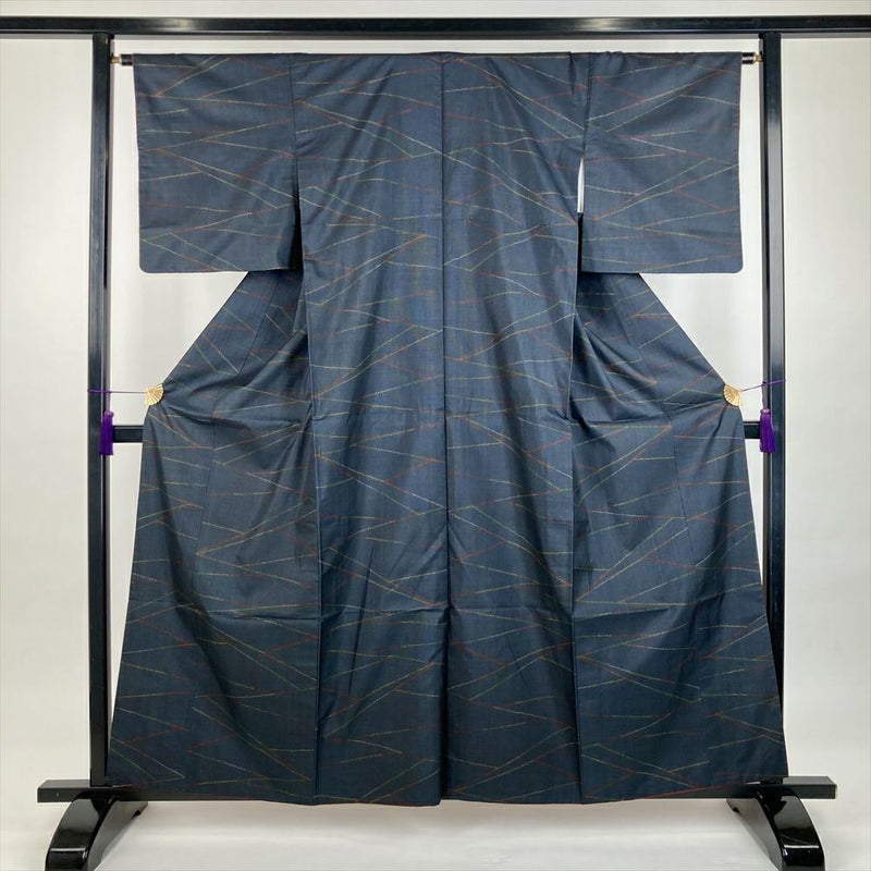 (中古)紬 墨黒 薄藍 紺 カジュアル 織り 割り付け 抽象柄 袷 S【身丈】155cm【裄丈】64.5cm