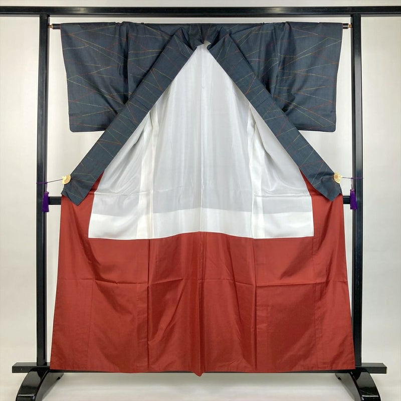 ひかえめな光沢があり、手触りや肌触りがよく軽くて丈夫です。普段着やおしゃれ着として使えるカジュアルなお着物です。衿裏、胴裏にシミ汚れがございます。保存臭がややございます。