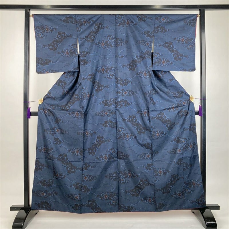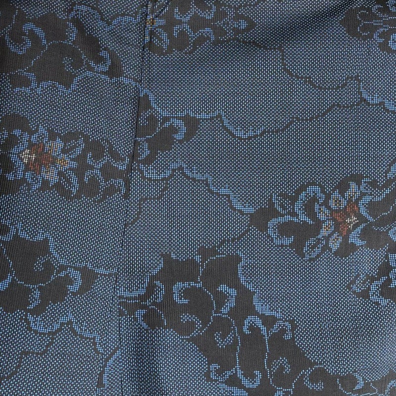 (中古)紬 黒 薄藍 紺 カジュアル 織り 雲取り 唐花唐草 袷 S【身丈】158.5cm【裄丈】65.5cm