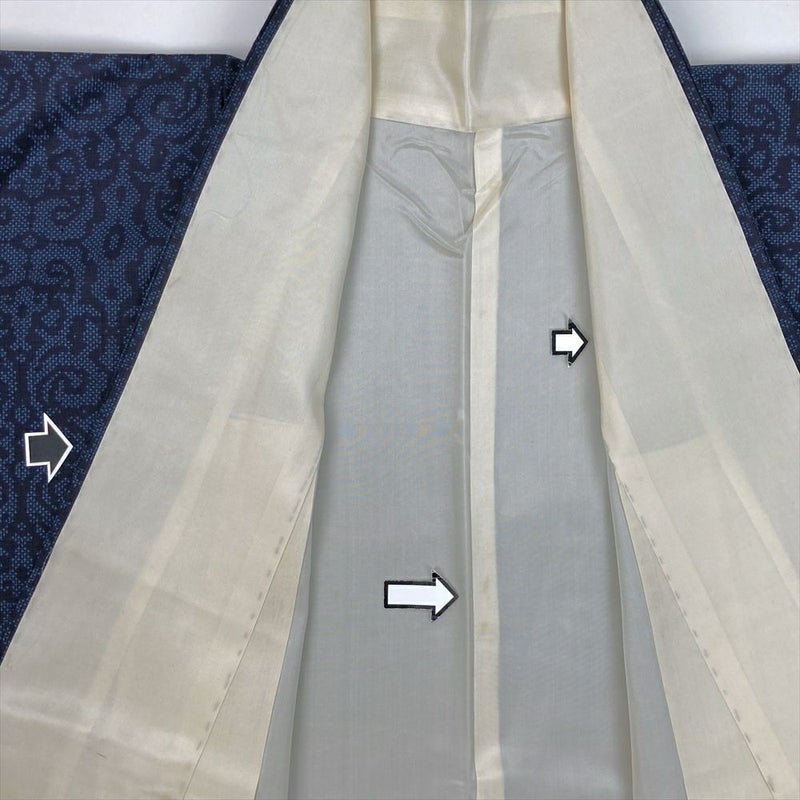泥と絹糸から生まれる美しい織物大島紬は、すべすべした肌触り、ひかえめな光沢、緻密な絣模様が特徴です。軽くてシワになりにくく着心地も抜群です。保存臭がややございます。衿裏 胴裏シミあり。大島紬