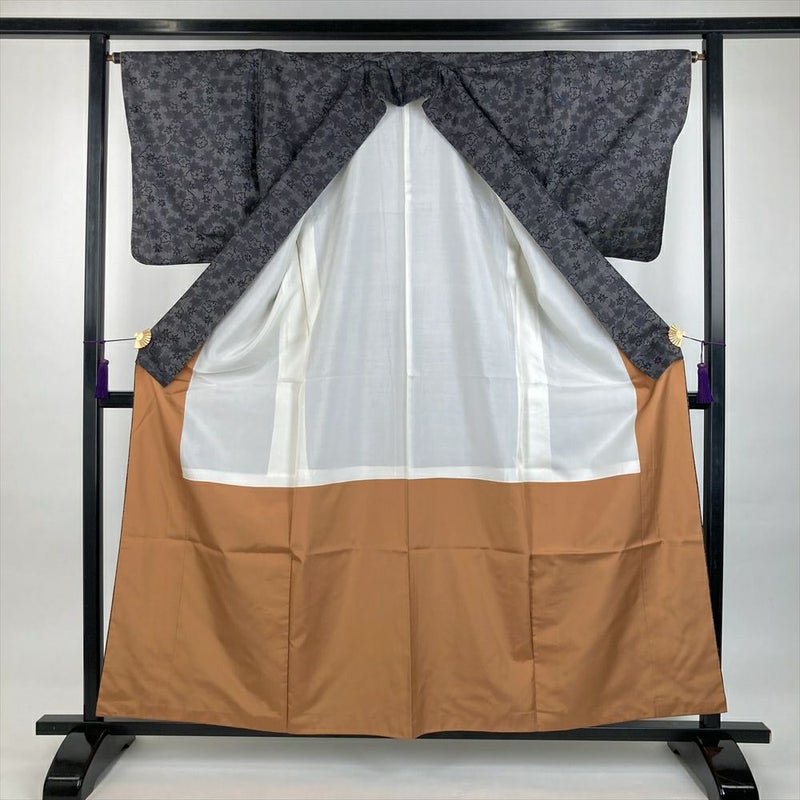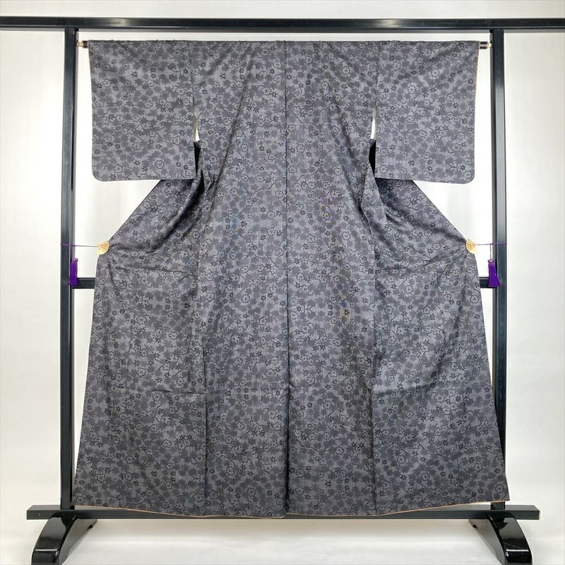 (中古)紬 灰色 グレー カジュアル 織り 5マルキ 桜尽くし 袷 S【身丈】156cm【裄丈】65cm