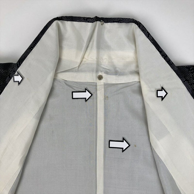 泥と絹糸から生まれる美しい織物大島紬は、すべすべした肌触り、ひかえめな光沢、緻密な絣模様が特徴です。軽くてシワになりにくく着心地も抜群です。胴裏にシミ汚れがございます。保存臭がややございます。大島紬