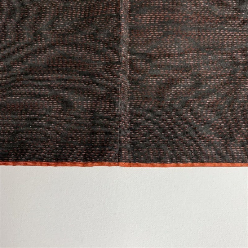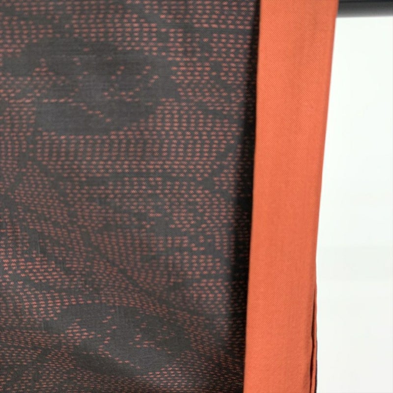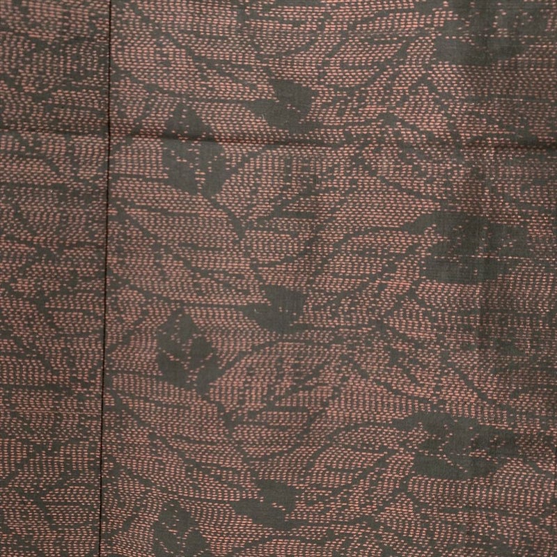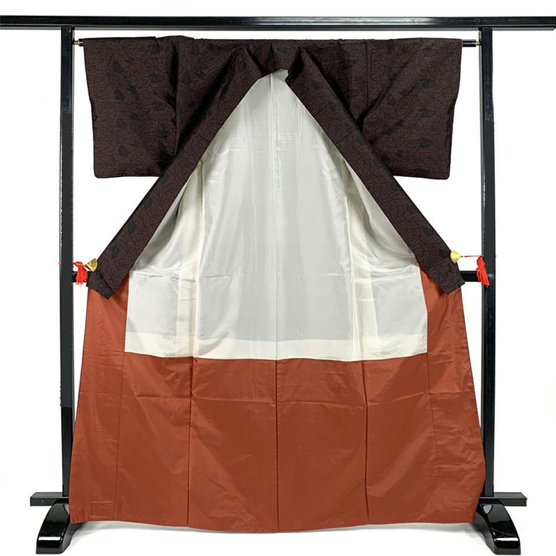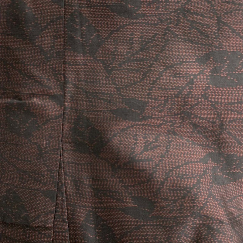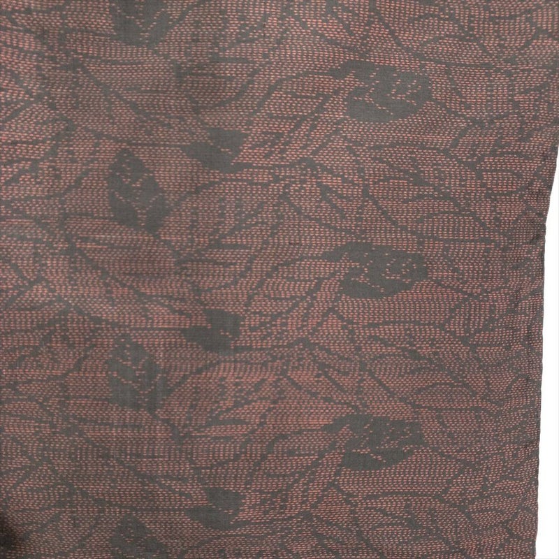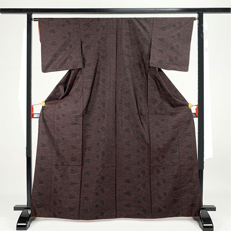 赤茶のベースに黒の葉模様が切り絵のようにデザインされた大島紬です。お出かけなどカジュアルなシーンでお召しいただけます。胴裏にスナップの錆跡がございますが着用には問題のない程度と考えられます。