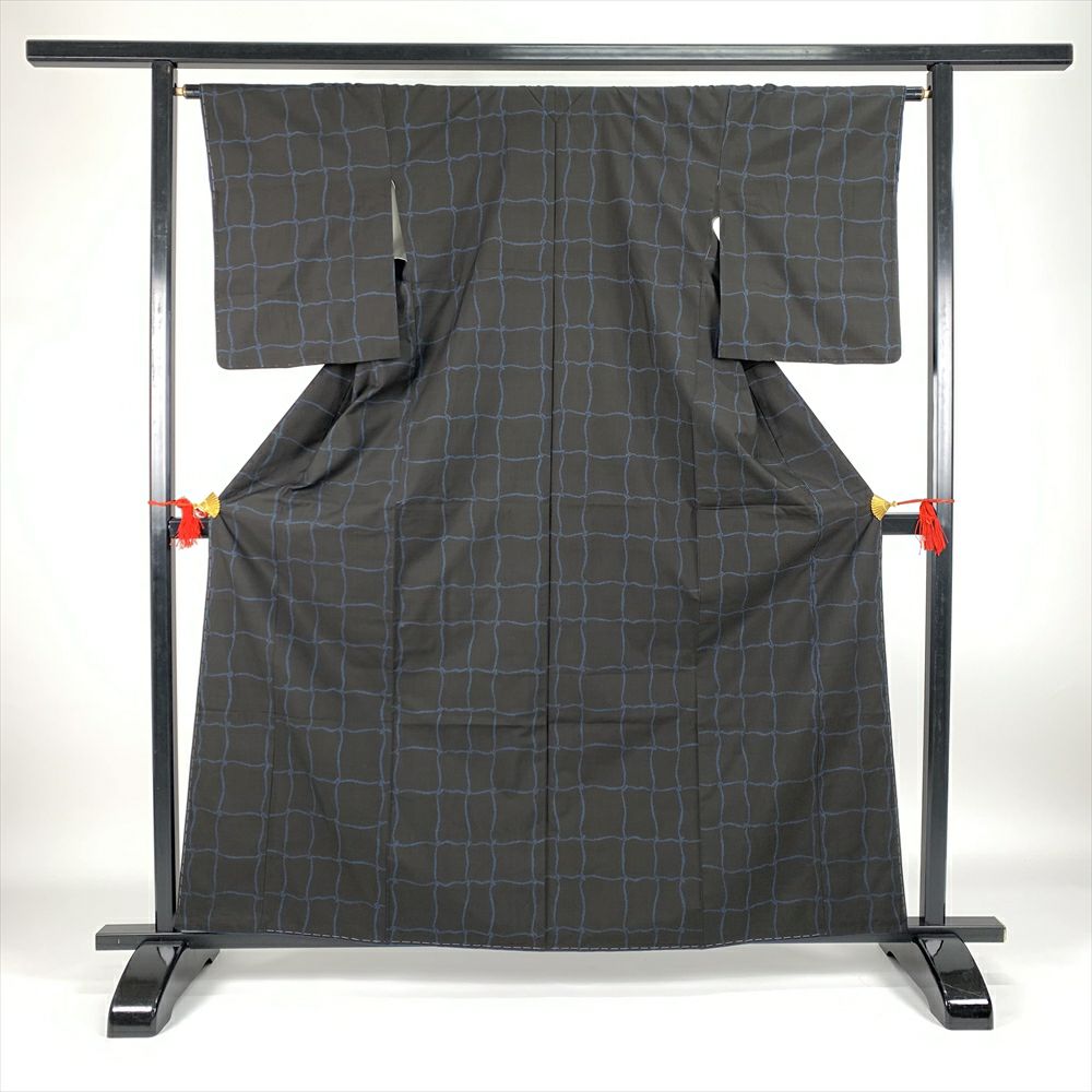 (中古)大島紬 カジュアル 黒 袷 網模様 クール S【身丈】158cm【裄丈】64.5cm