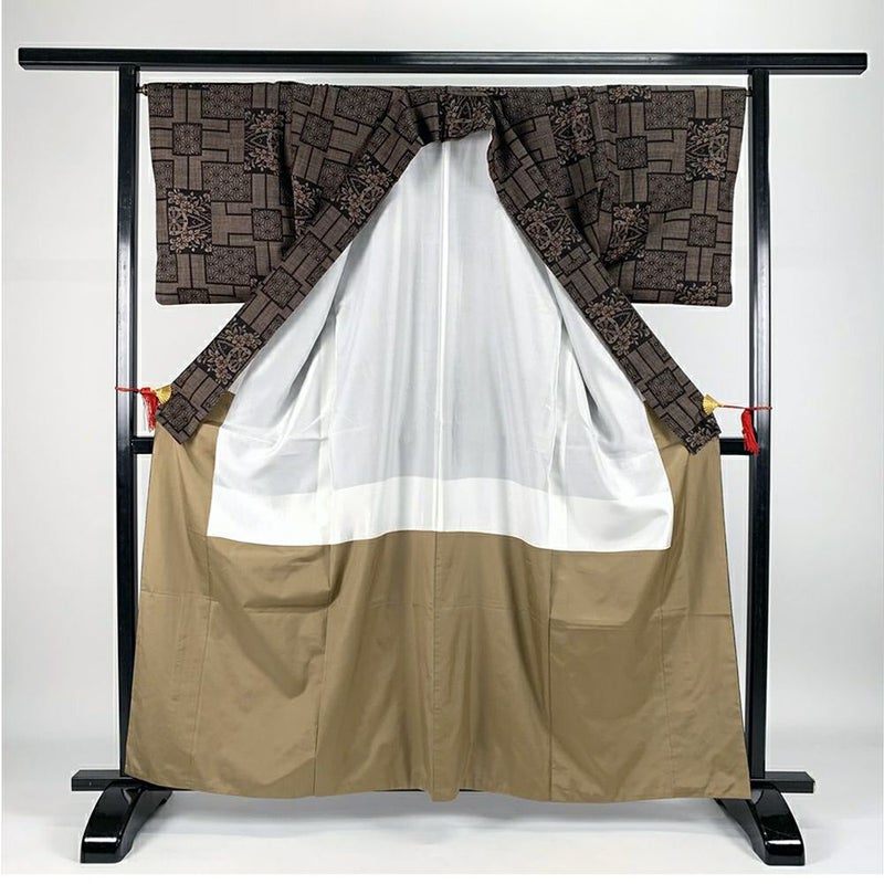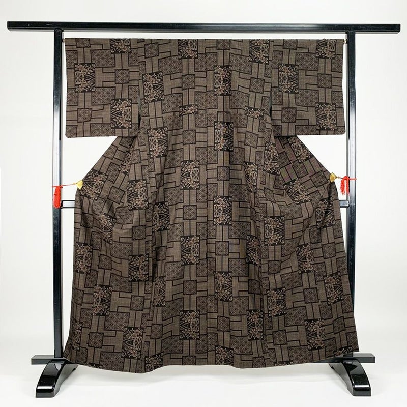 茶色地に幾何学模様と古典柄で織られた大島紬です。タグついています。お出かけなどカジュアルなシーンでお召しいただけます。