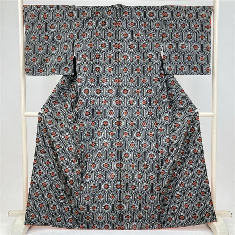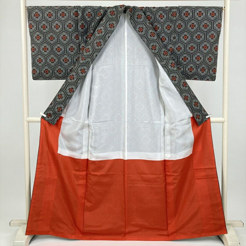 (中古) 紬 黒 カジュアル 亀甲に花 袷 絹【身丈】160cm【裄丈】67.5cm