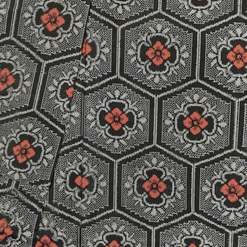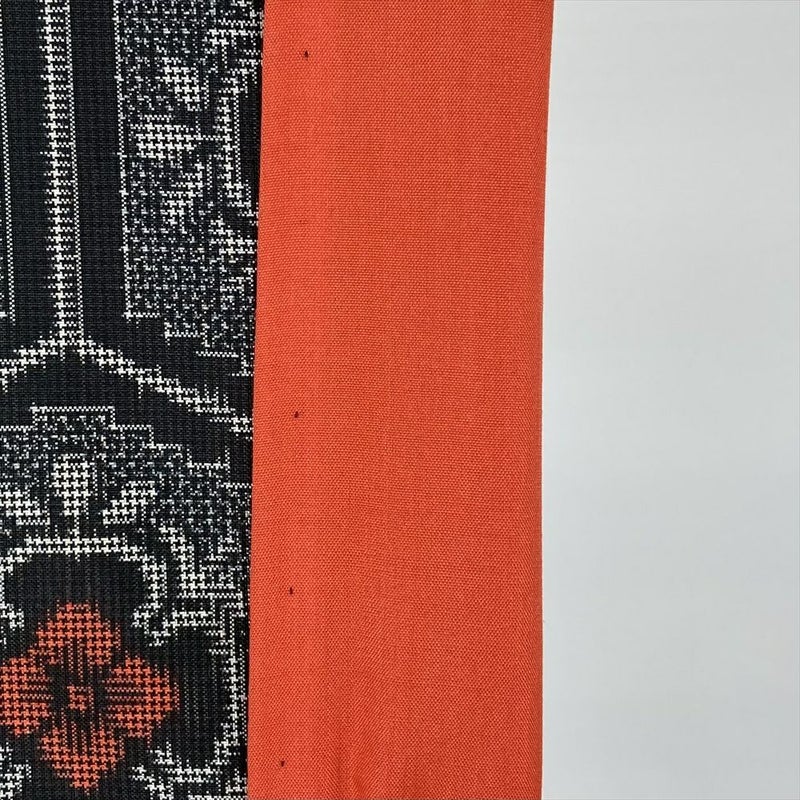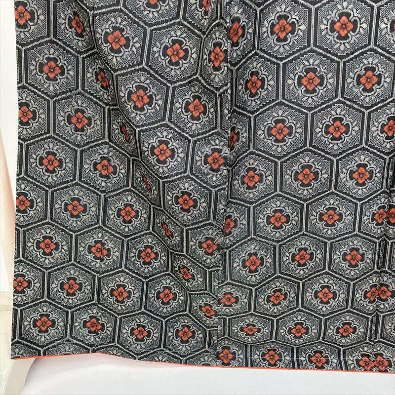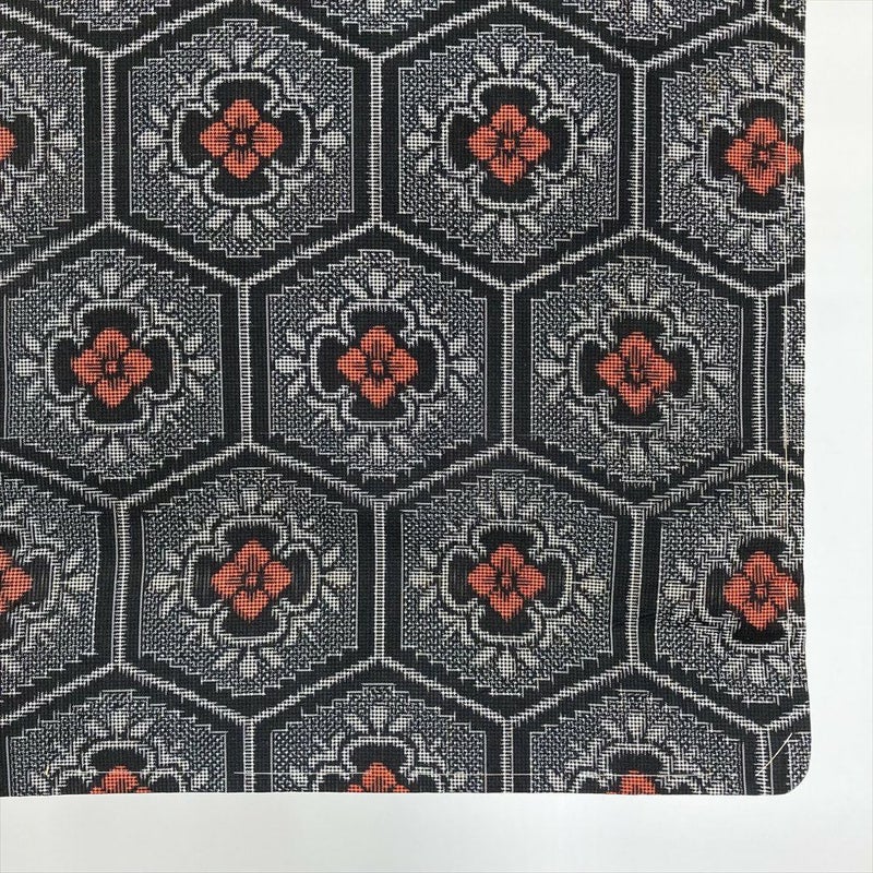 艶やかな黒地に、情熱的な赤い花が規則正しく並ぶ亀甲文様。