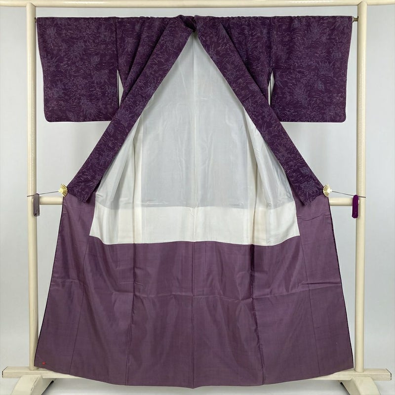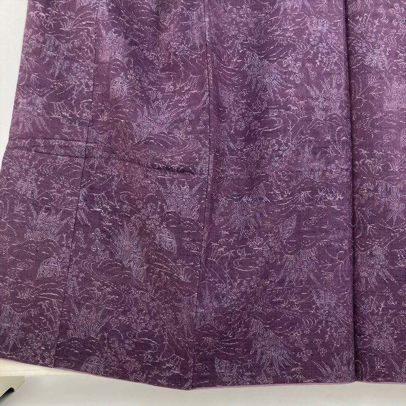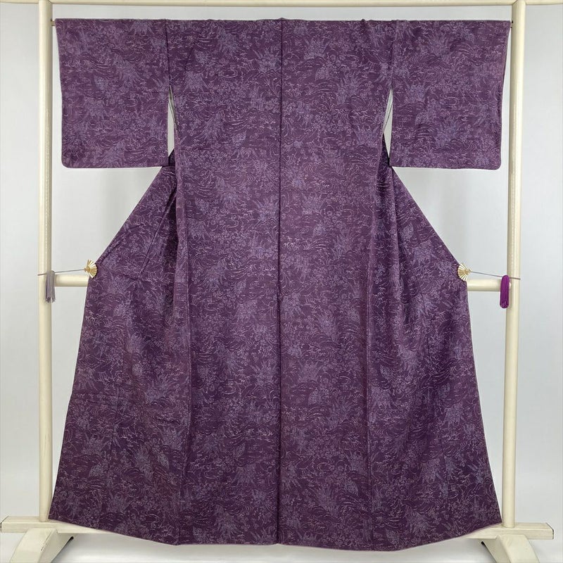 【水辺に四季の花咲く庭園柄、落ち着いた紫色の正絹紬小紋】