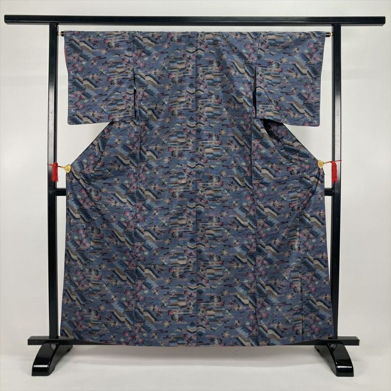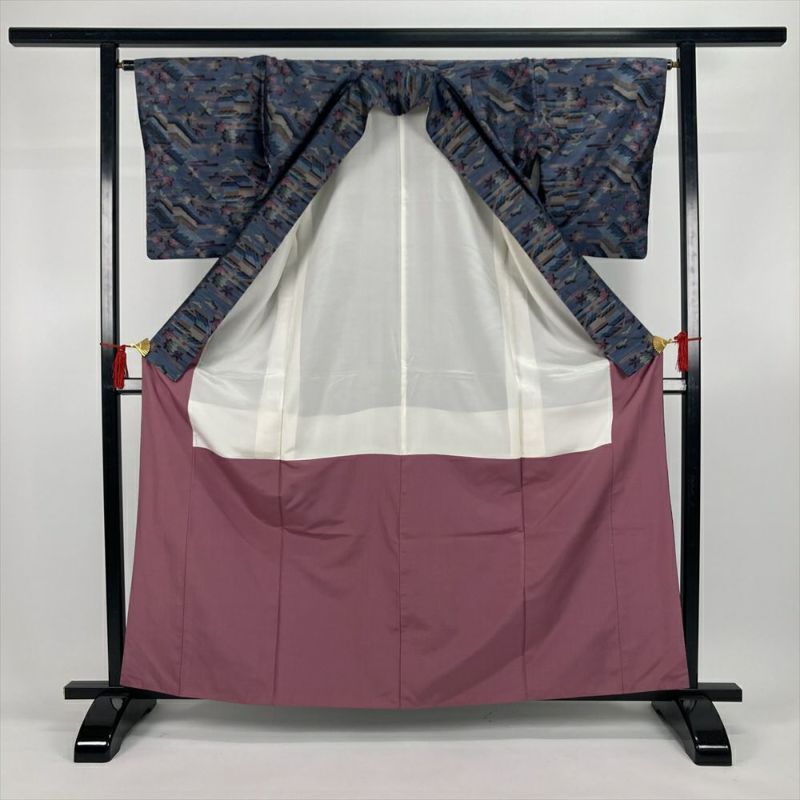 小紋に比べ、よりカジュアルな街着になります。大島紬のような手触りで、光沢が美しいお着物です。胴裏右胸辺りに薄く大き目なシミ、衿裏に小さな汚れがありますが、着用には問題ありません。
