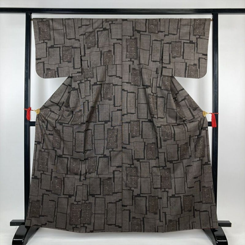 (中古)大島紬 茶 カジュアル 紬 5マルキ 短冊 蔓 七宝 袷 M【身丈】160.5cm【裄丈】67cm