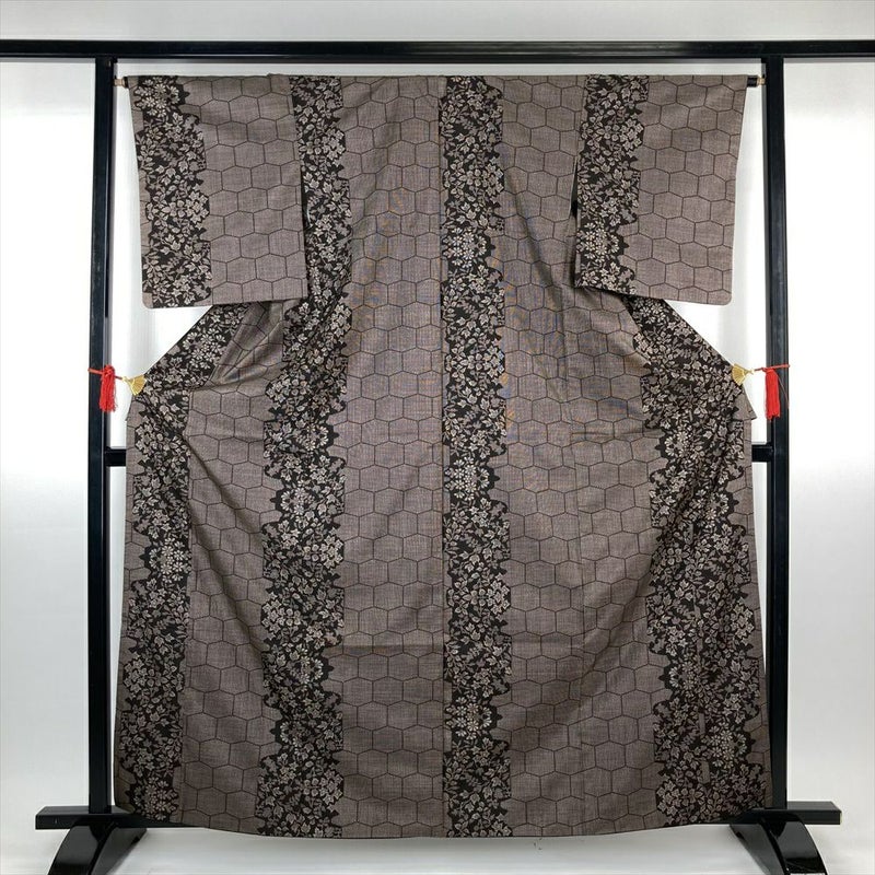 (中古)大島紬 茶 カジュアル 紬 5マルキ 亀甲繋ぎ 菊 蔦 袷【身丈】159.5cm【裄丈】65.5cm