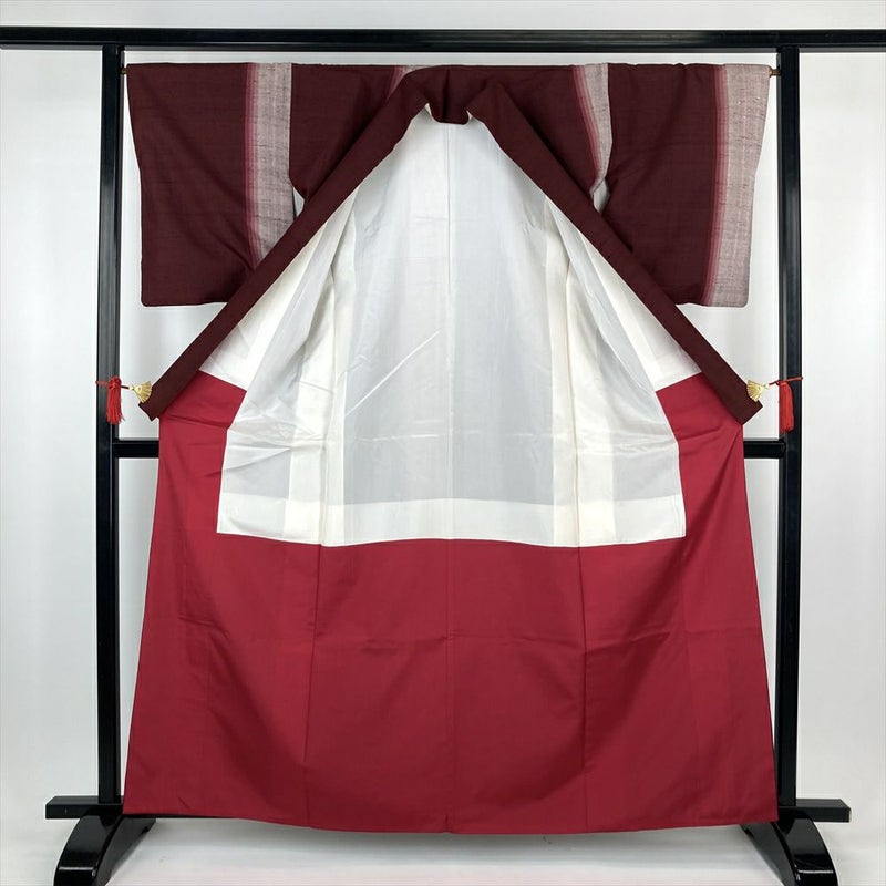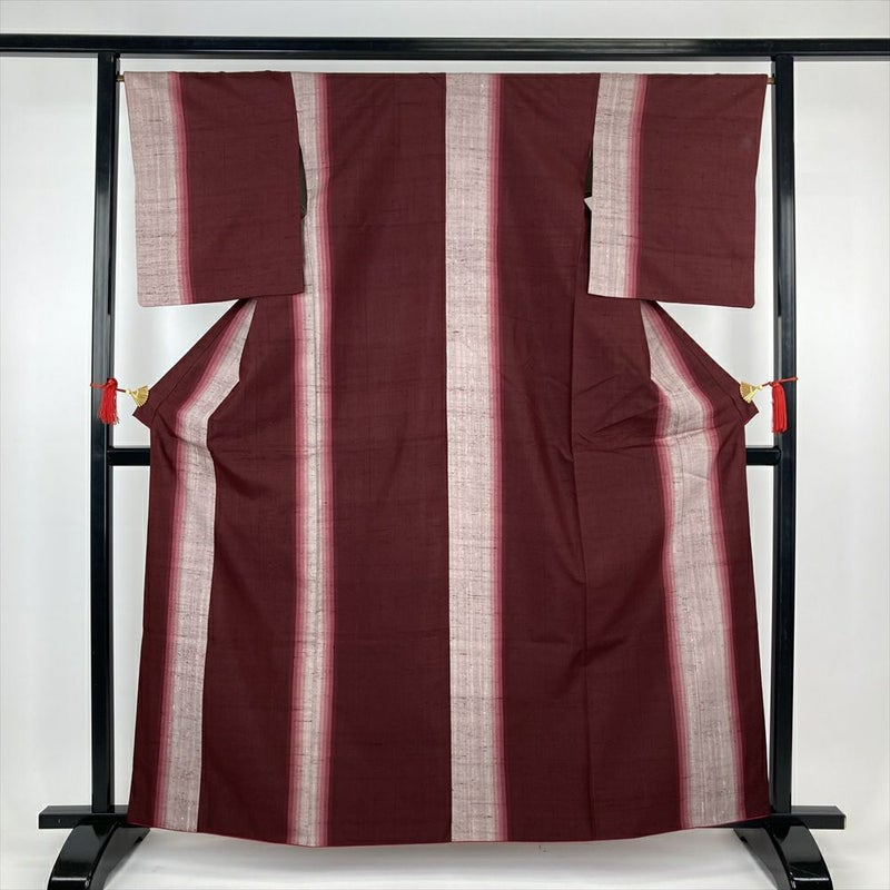 (中古)紬 臙脂 カジュアル 鰹縞 袷 S【身丈】158.5cm【裄丈】66cm