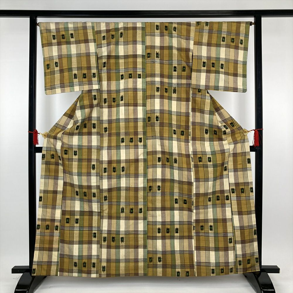 (中古)紬 黄色 カジュアル 絣 変わり格子 袷 M【身丈】160cm【裄丈】66cm