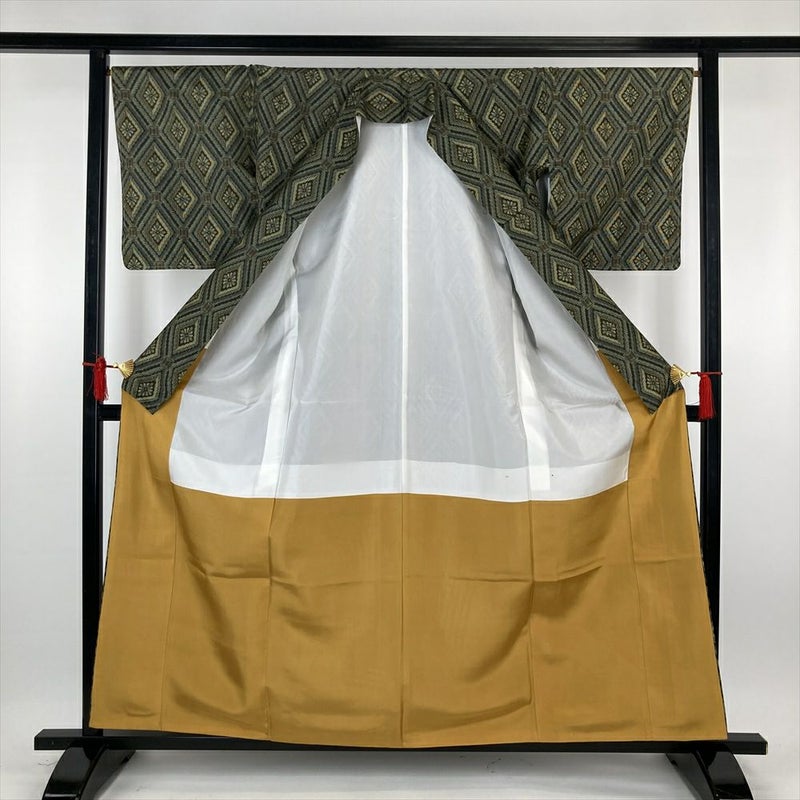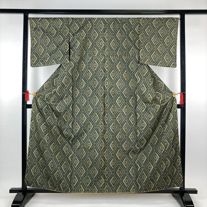 (中古)紬 緑 カジュアル 絣 花菱 袷 S【身丈】157.5cm【裄丈】67cm
