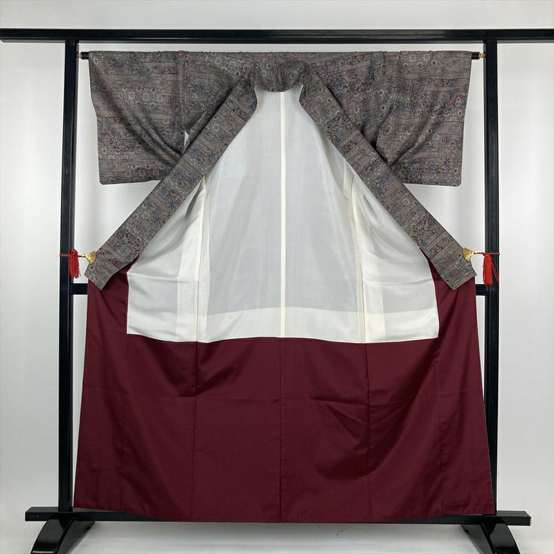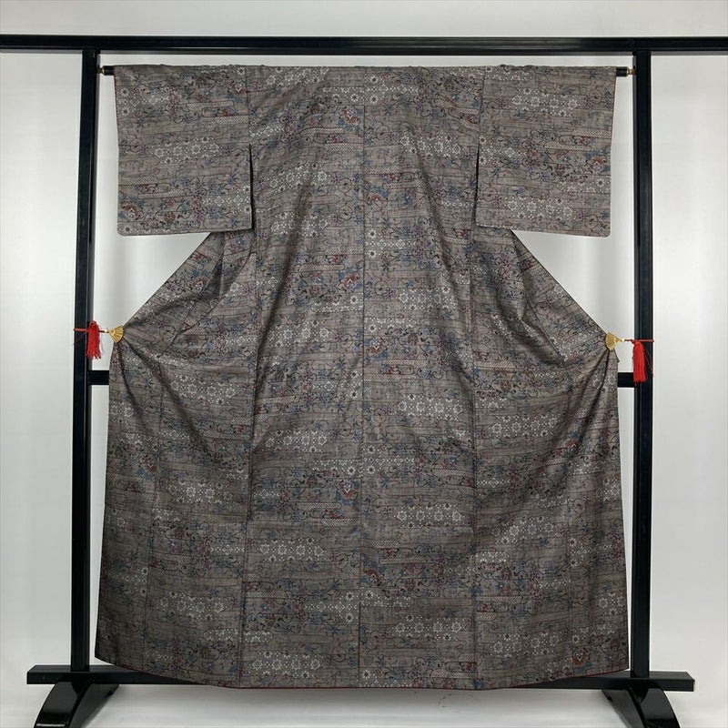 (中古)大島紬 茶 カジュアル 7マルキ エ霞 華文 蔓花 紗綾型 袷 S【身丈】157.5cm【裄丈】65.5cm
