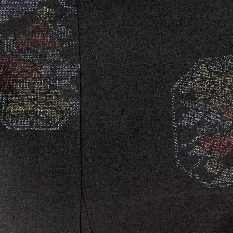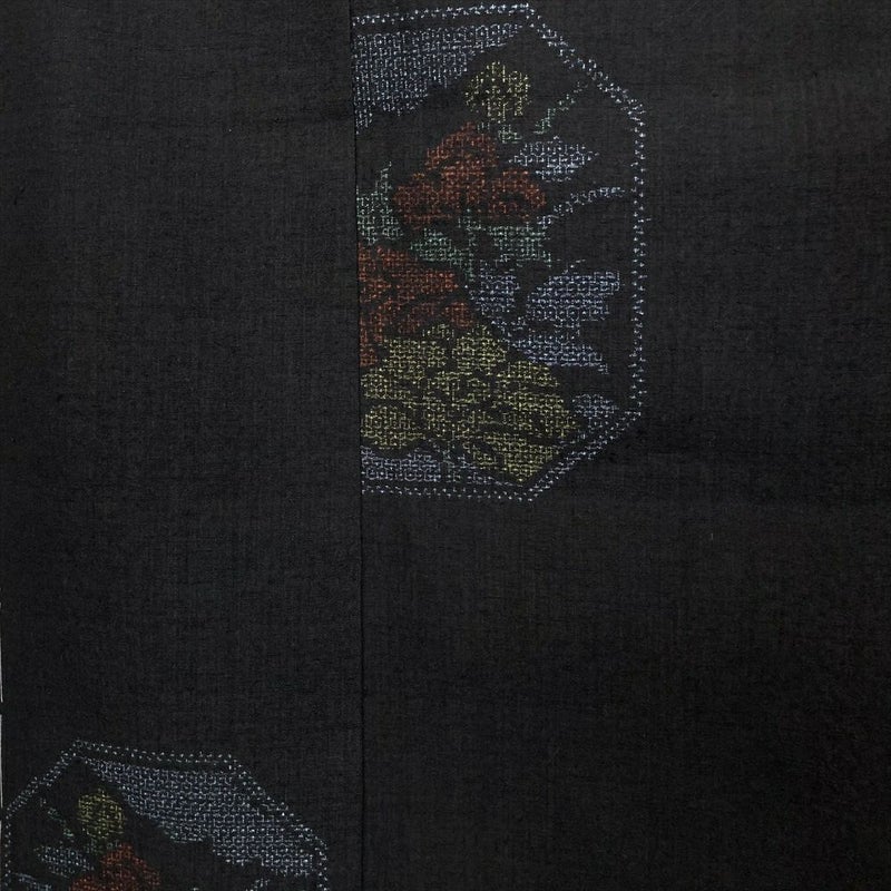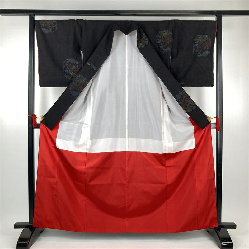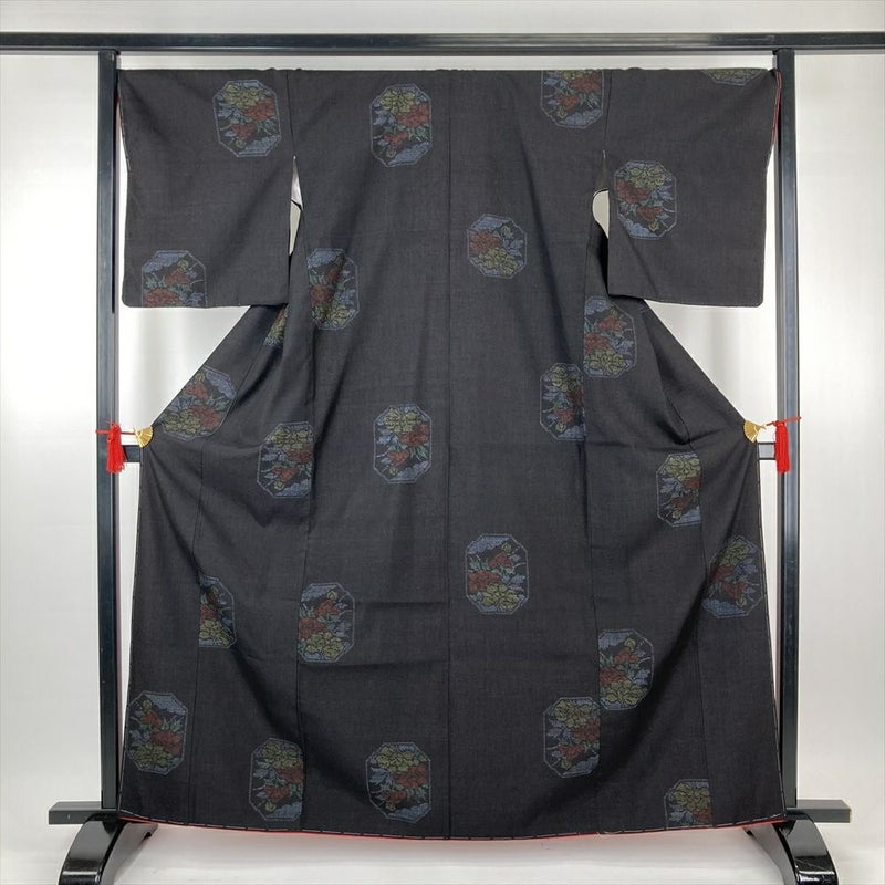 (中古)結城紬 黒 カジュアル 飛び柄 牡丹 袷 M【身丈】161cm【裄丈】69.5cm