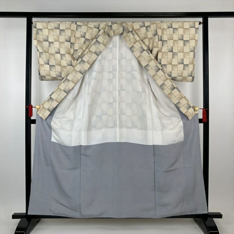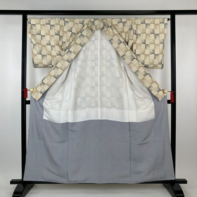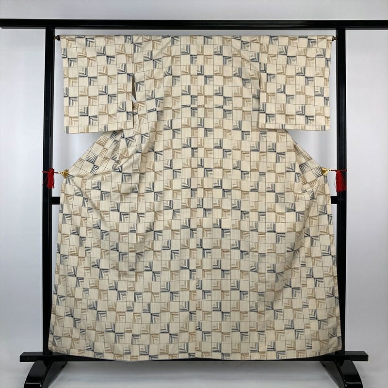 (中古)紬 生成り カジュアル 変わり格子 変わり縞 袷 S【身丈】155cm【裄丈】66.5cm
