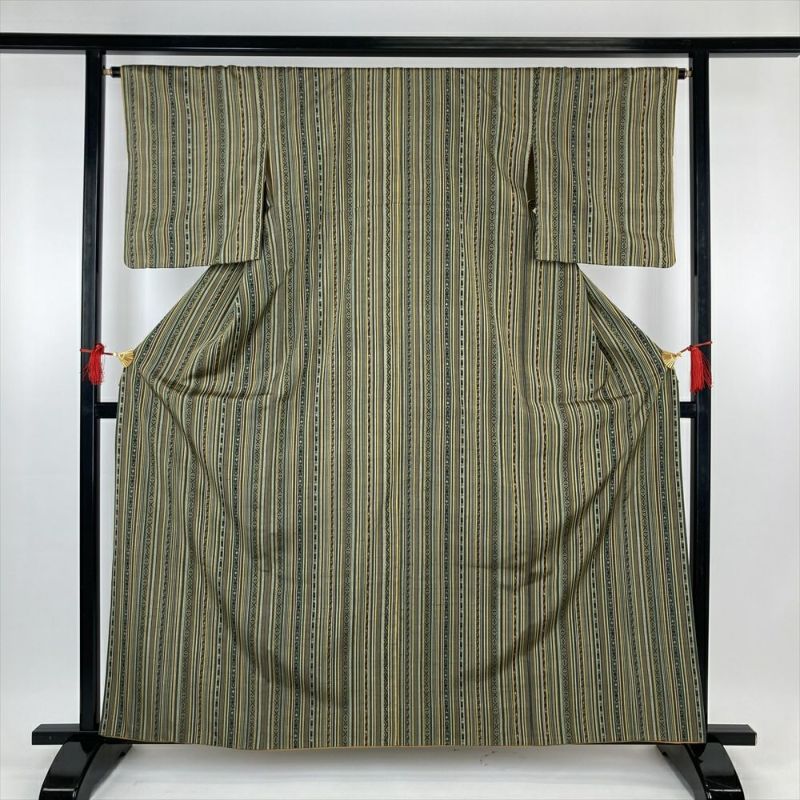 (中古)紬 モスグリーン 芥子 赤茶 カジュアル 変わり間道 幾何学 オリエンタル 袷 S【身丈】157cm 【裄丈】64cm
