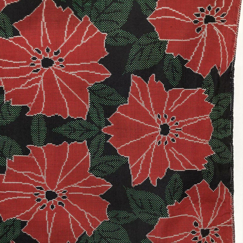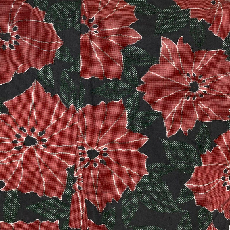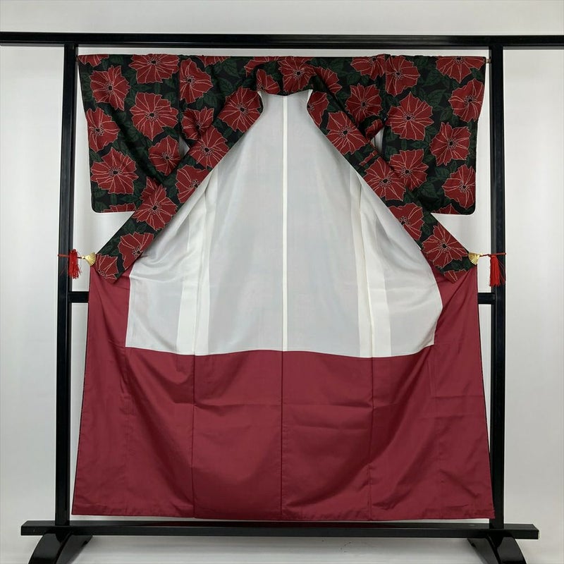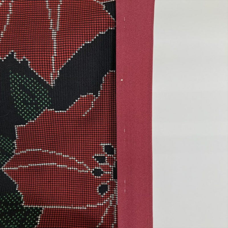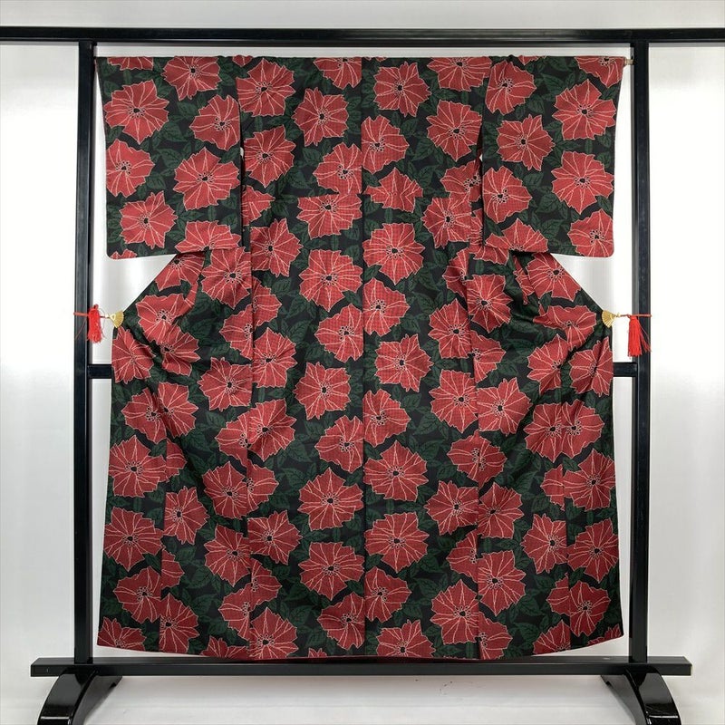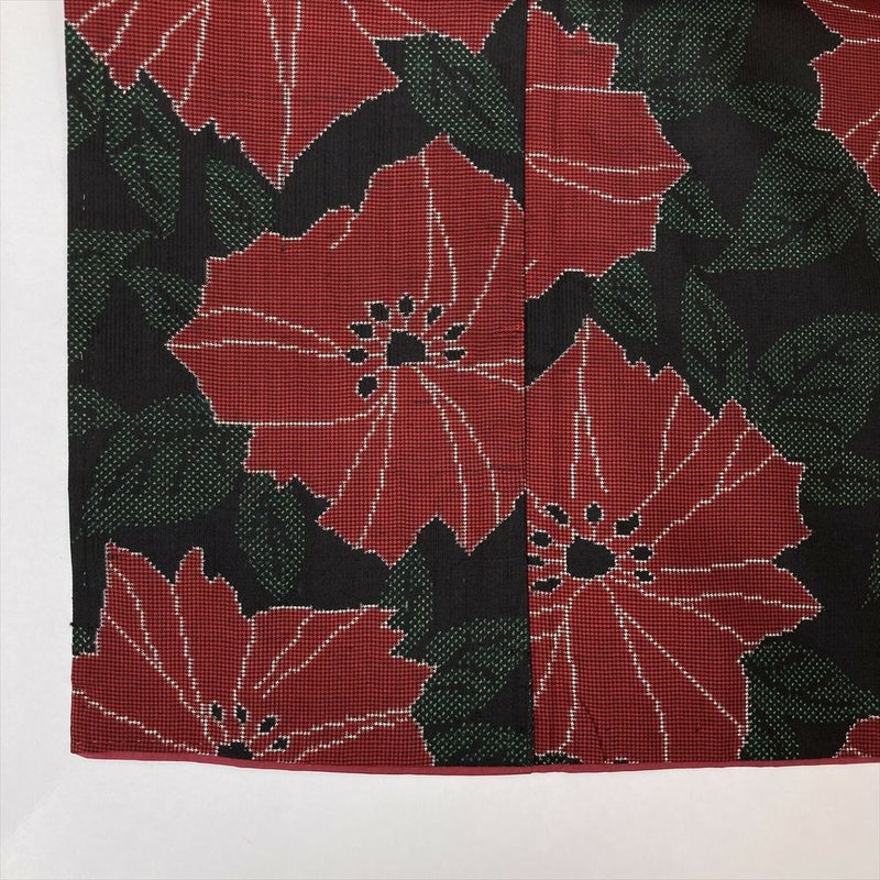 (中古)大島紬 黒 カジュアル 植物 赤花 葉 袷 SS【身丈】154cm 【裄丈】67.5cm