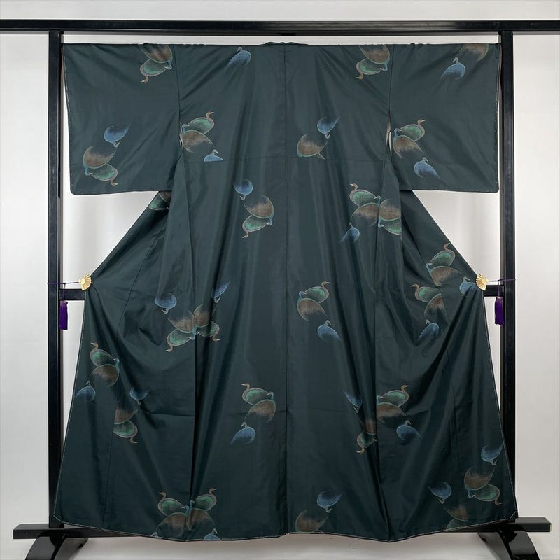 (中古)大島紬 深緑 カジュアル 絣 鳥 鶴 袷 SS【身丈】154cm 【裄丈】69cm