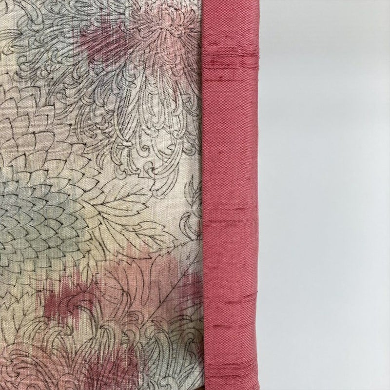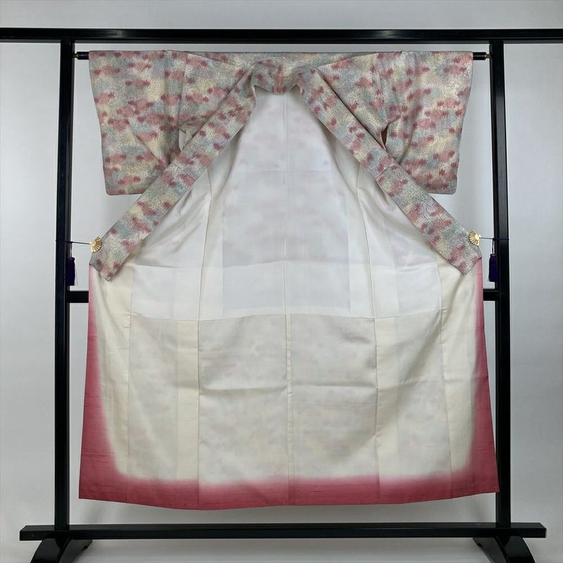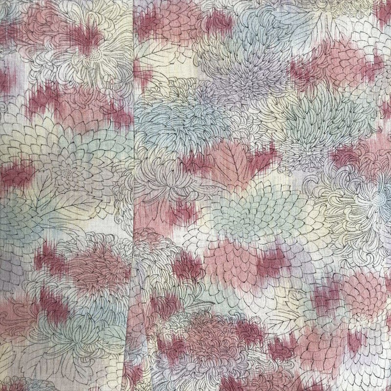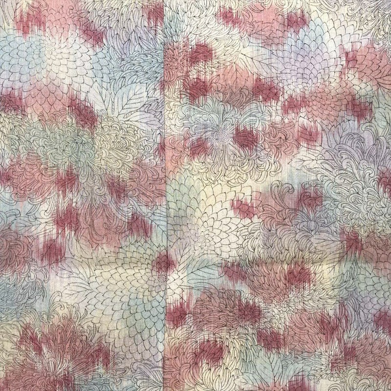ベージュ地にピンクや水色の暈しを効かせた上に、菊の草花を線描きした紬になります。
