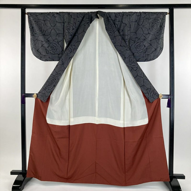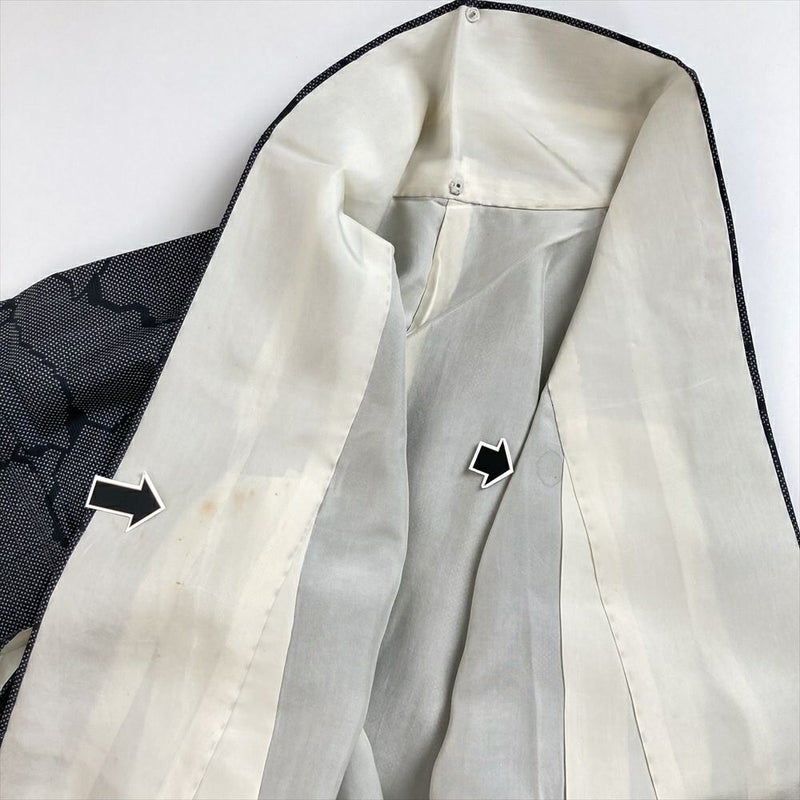 緻密で美しい図柄に、水にぬれた烏の羽のように深くつやつやした色味、しなやかな肌触りと軽やかな着心地が魅力です。同窓会や結婚式の二次会、観劇や美術館巡り、ショッピングなど、紬の着物は普段着ですから、幅広い用途で使用できます。リユース品ですが、まだ十分ご愛用いただけると存じます。衿裏、胴裏、裾回し、左前袖、左右袖口にシミ汚れがございます。保存臭がややございます。
