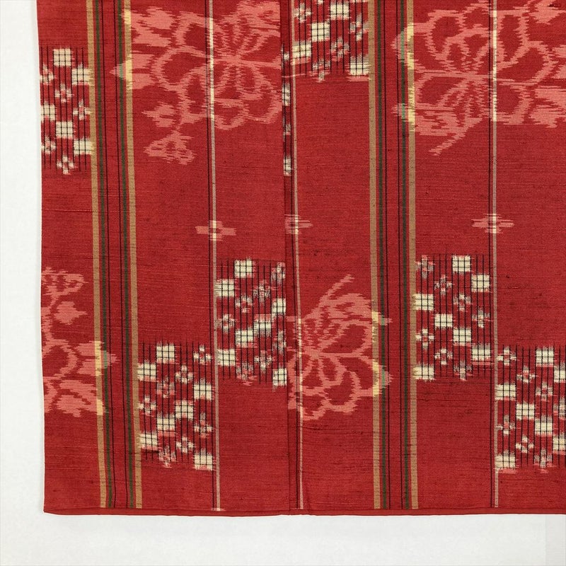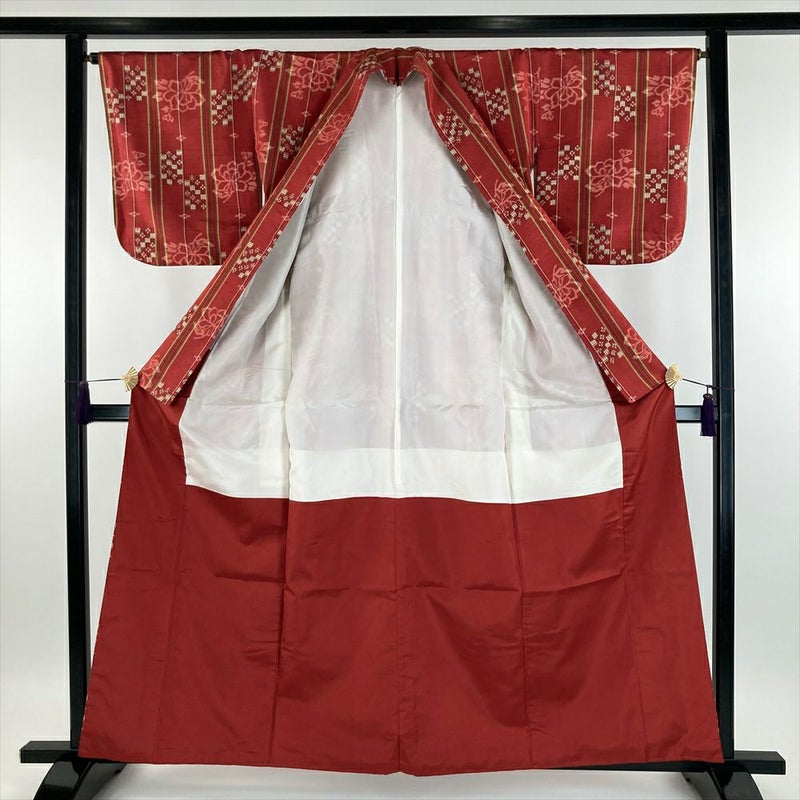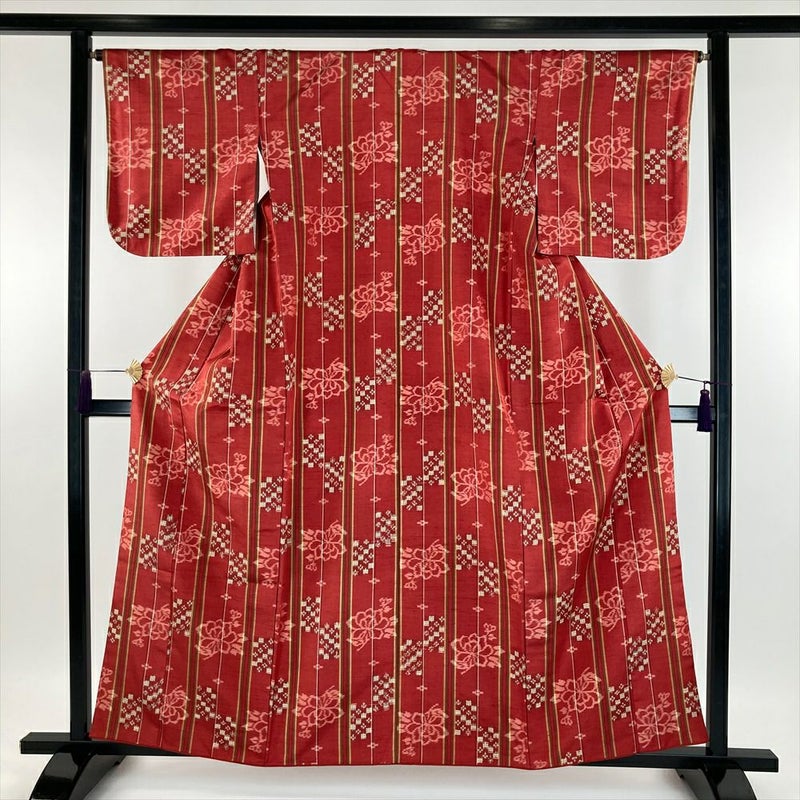 (中古) 紬 赤色 レッド系 カジュアル 縞 変わり市松 牡丹 袷 SS 【身丈】154cm【裄丈】66cm