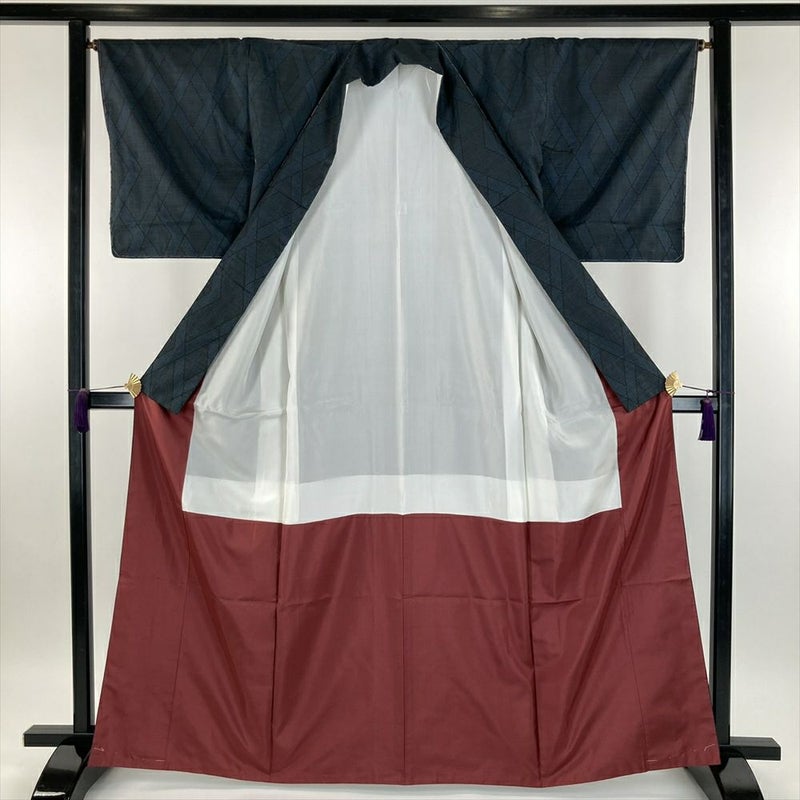 (中古) 大島紬 紺色 黒系 カジュアル 菱 幾何学柄 袷 M 【身丈】161.5cm【裄丈】66cm