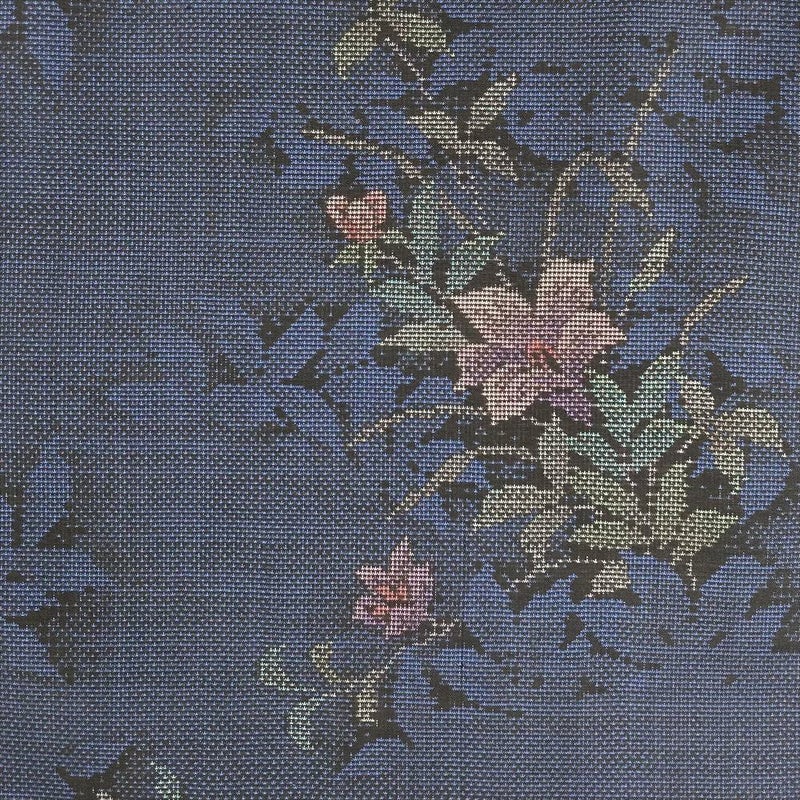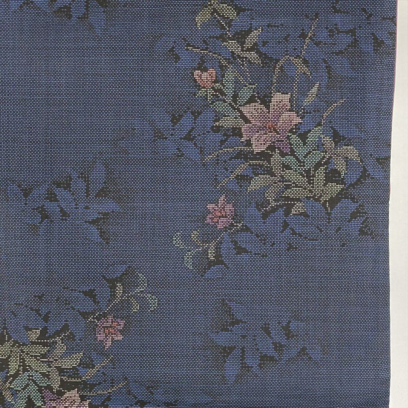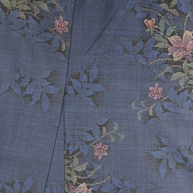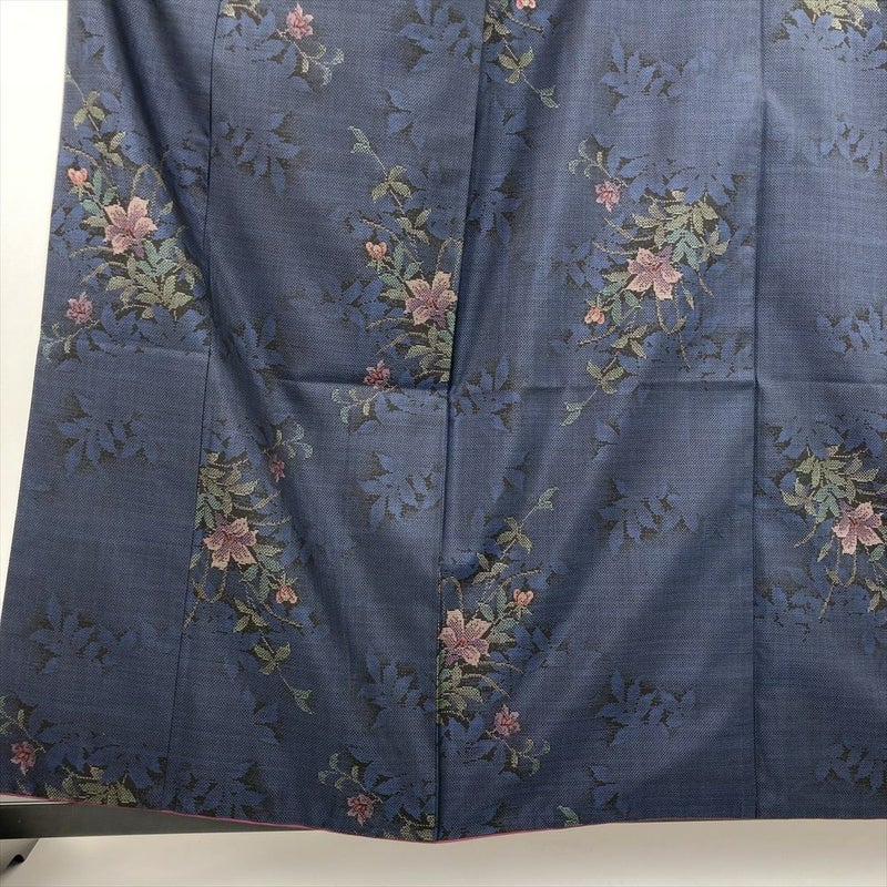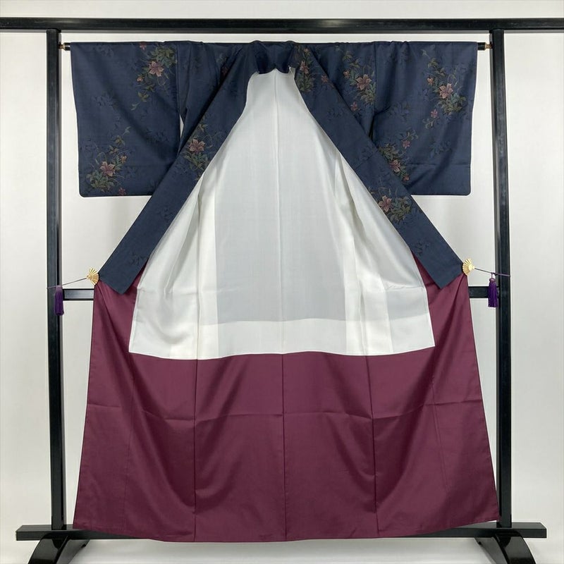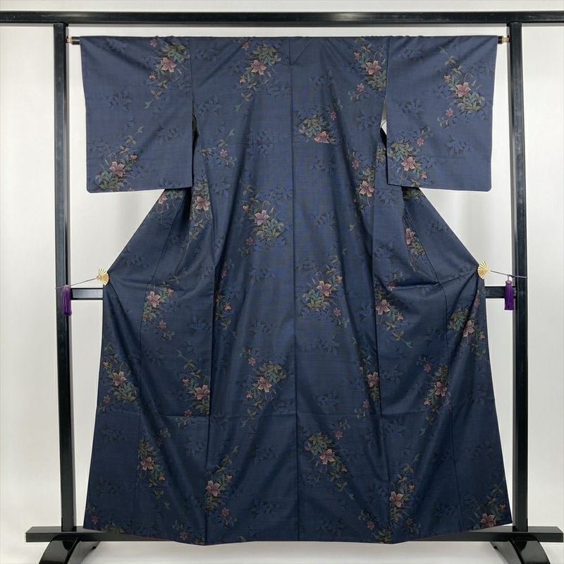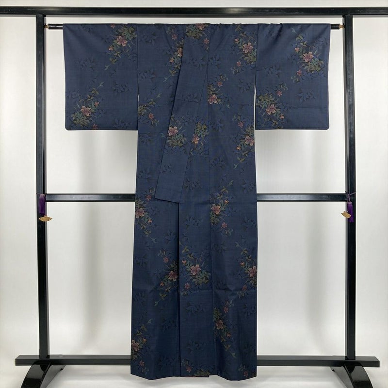 (中古) 大島紬 黒色/紺色 カジュアル 花葉 シルエット 袷【身丈】156cm【裄丈】64.5cm