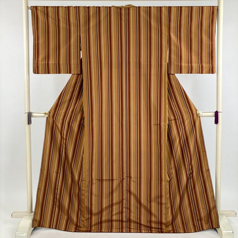 細やかな縞模様が、洗練された美しさを奏でる、金茶色の紬の袷着物。