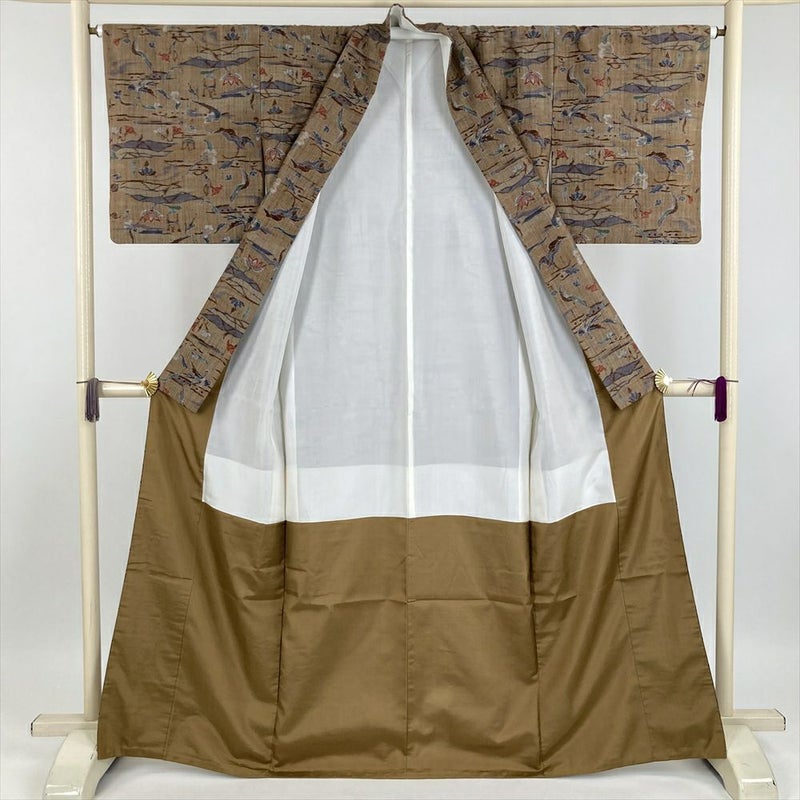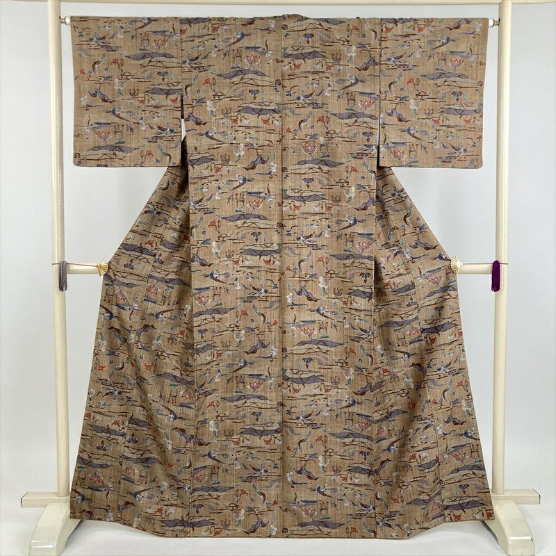 (中古) 紬 薄茶色 カジュアル 抽象柄 袷 絹 【身丈】160.5cm【裄丈】65cm
