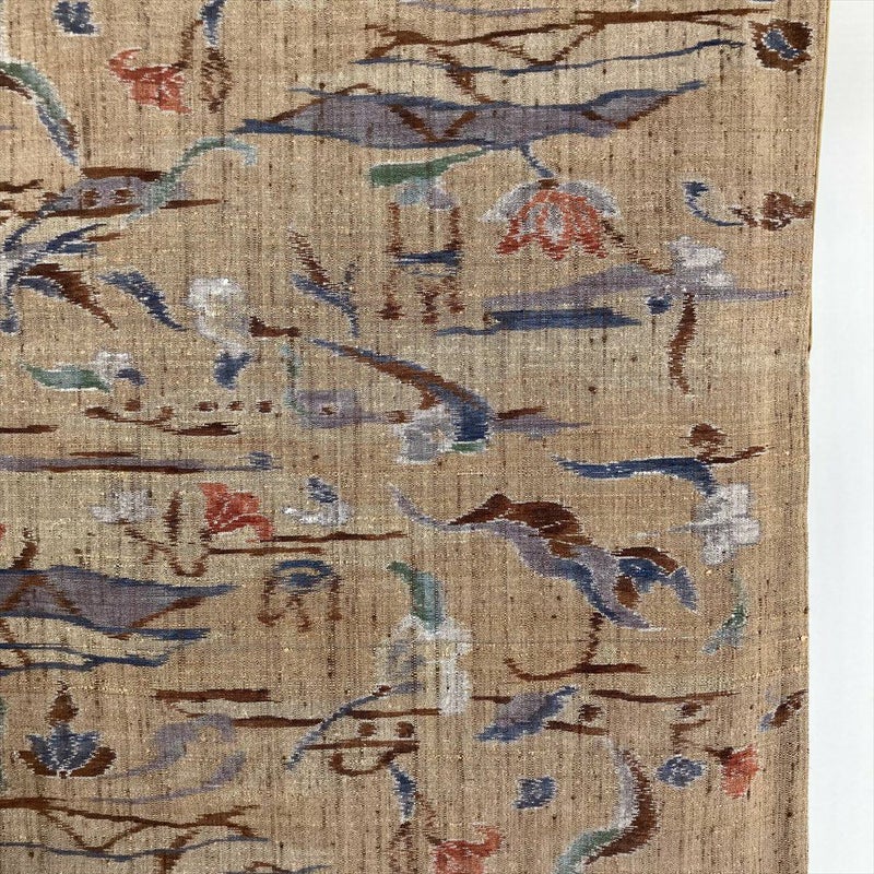 紬ならではの、艶感の少ない素朴な風合いが、おしゃれな茶色地に映え、上品で落ち着いた印象を与えます。抽象的な草花柄は、古典的な柄とは異なる、現代的なセンスを感じさせます。
