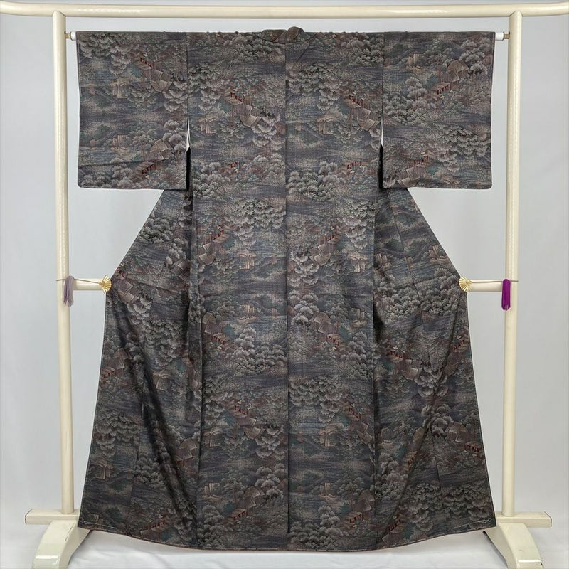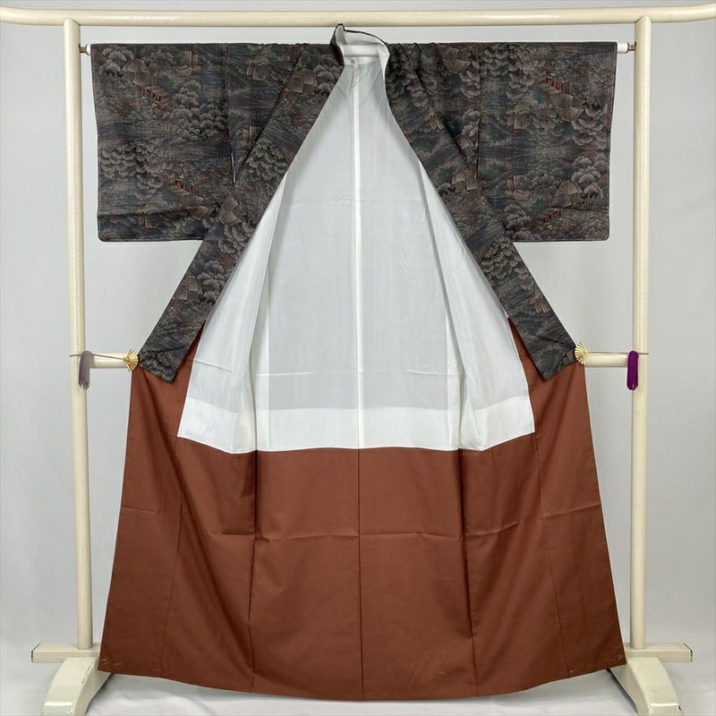 (中古) 大島紬 焦げ茶 カジュアル 入江 帆掛け船 袷 絹【身丈】157cm【裄丈】64cm