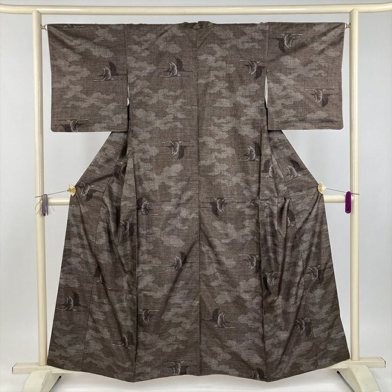 (中古) 大島紬 焦げ茶色 カジュアル 鶴 雲 袷 絹【身丈】153.5cm【裄丈】65.5cm