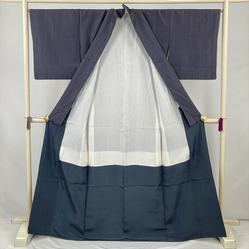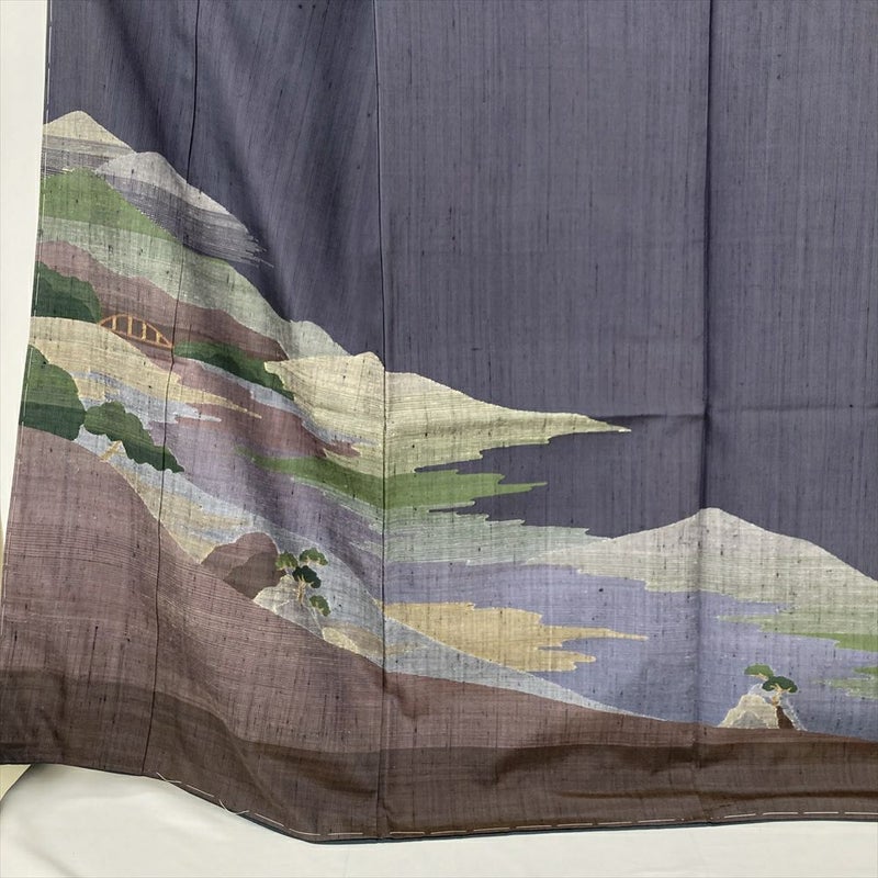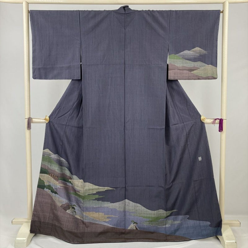 (中古) 紬訪問着 濃灰青 濃グレー カジュアル セミフォーマル 景色 袷 絹【身丈】162cm【裄丈】66.5cm