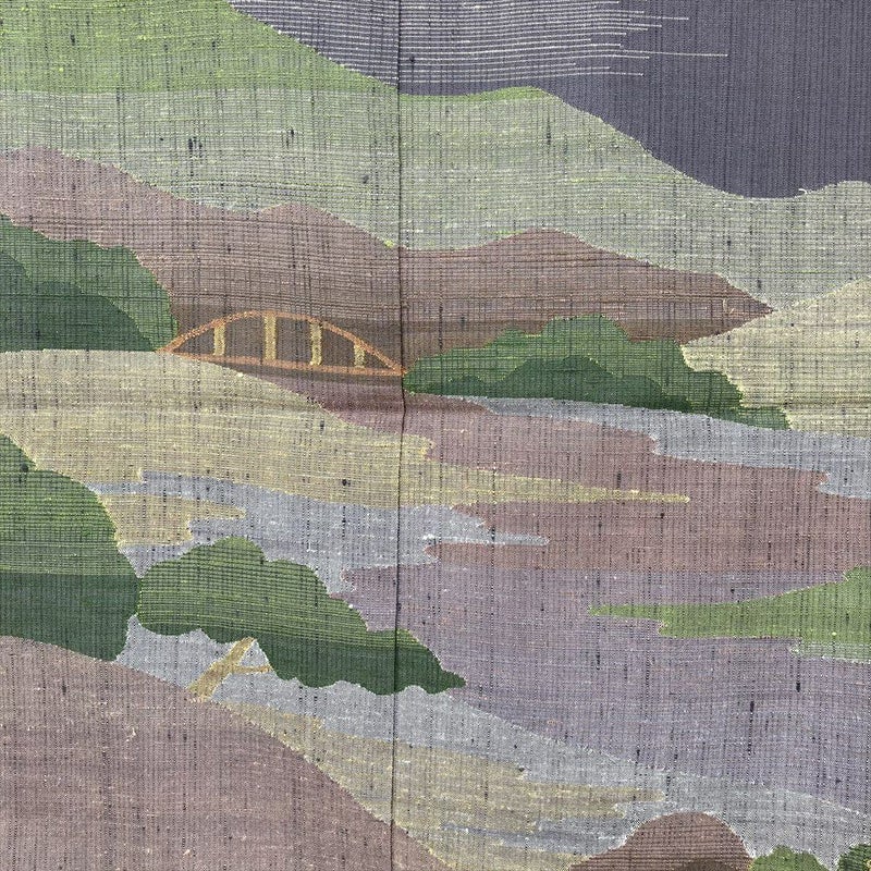 素朴な風合いの紬地に、まるで一枚の絵画をまとうかのように、奥行きのある景色が織り出された特別な訪問着です。