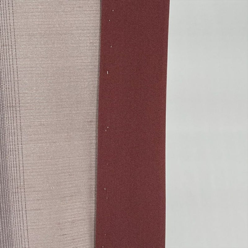 素朴な風合いの紬地に、灰桜色から小豆色へと移り変わる、美しいグラデーションが染め上げられた着物です。