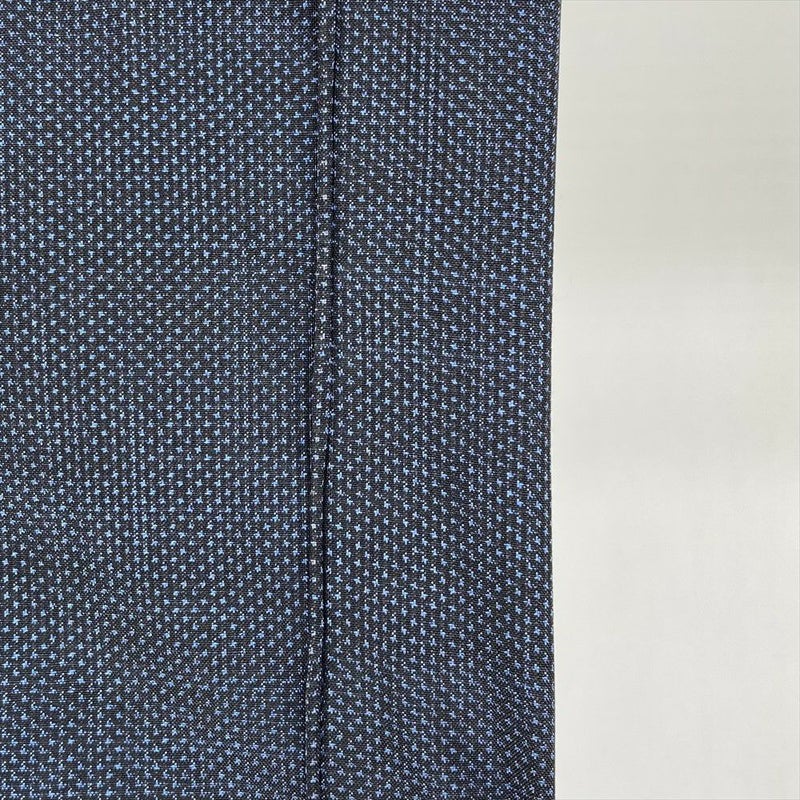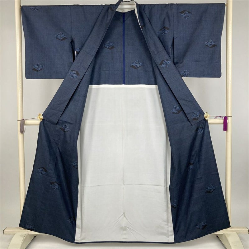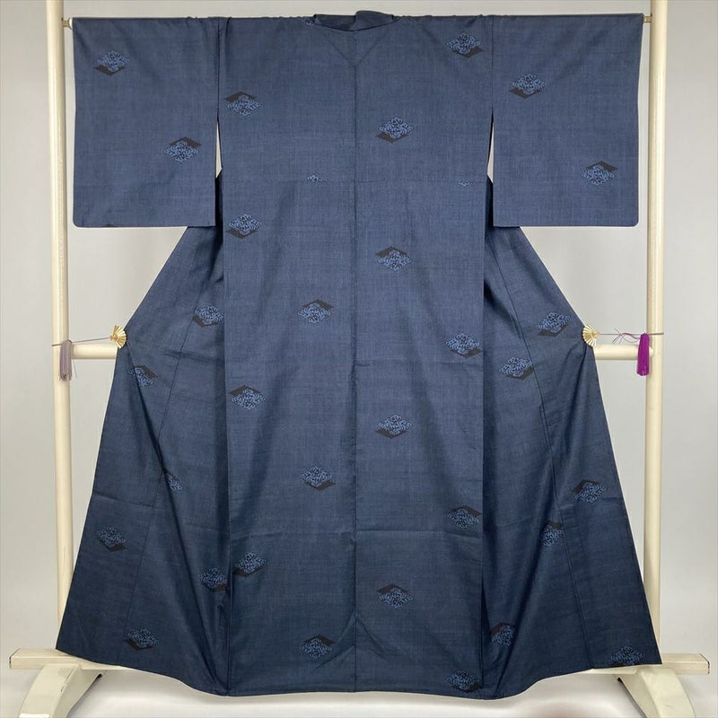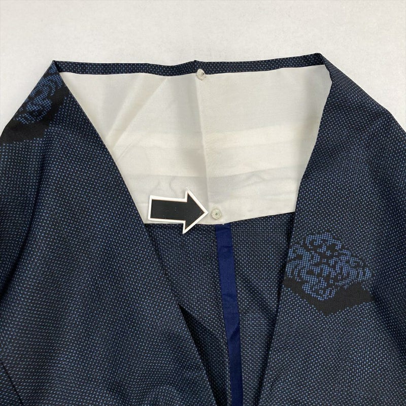(中古) 大島紬 黒 藍 カジュアル 菱に波頭 単衣 絹【身丈】154cm【裄丈】66cm