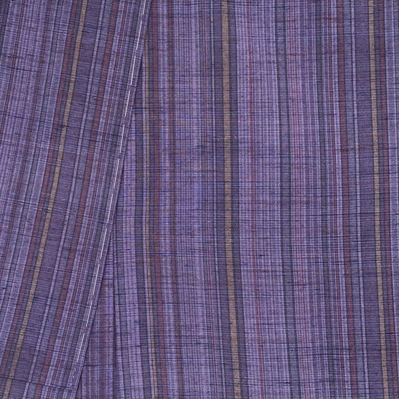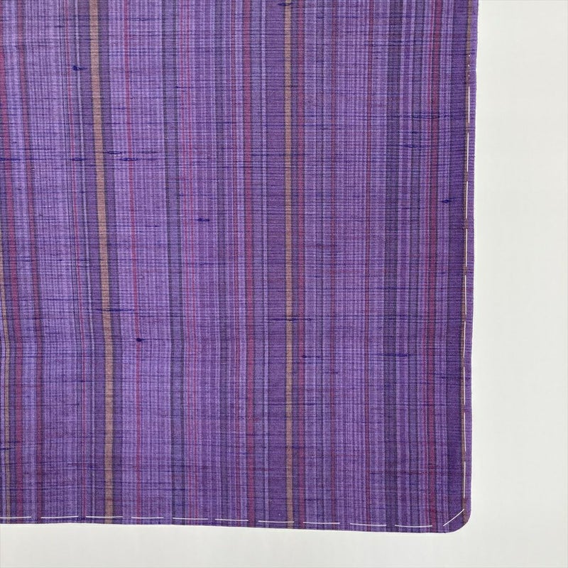 はっと目を引く美しい紫色に、モダンな縞文様が織りなすおしゃれな紬です。
